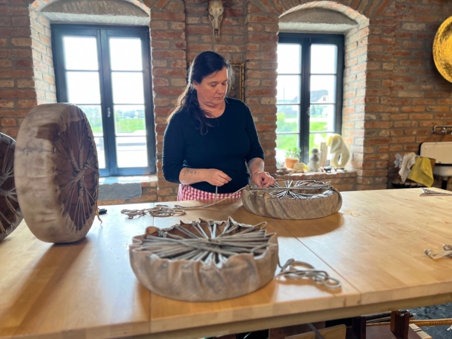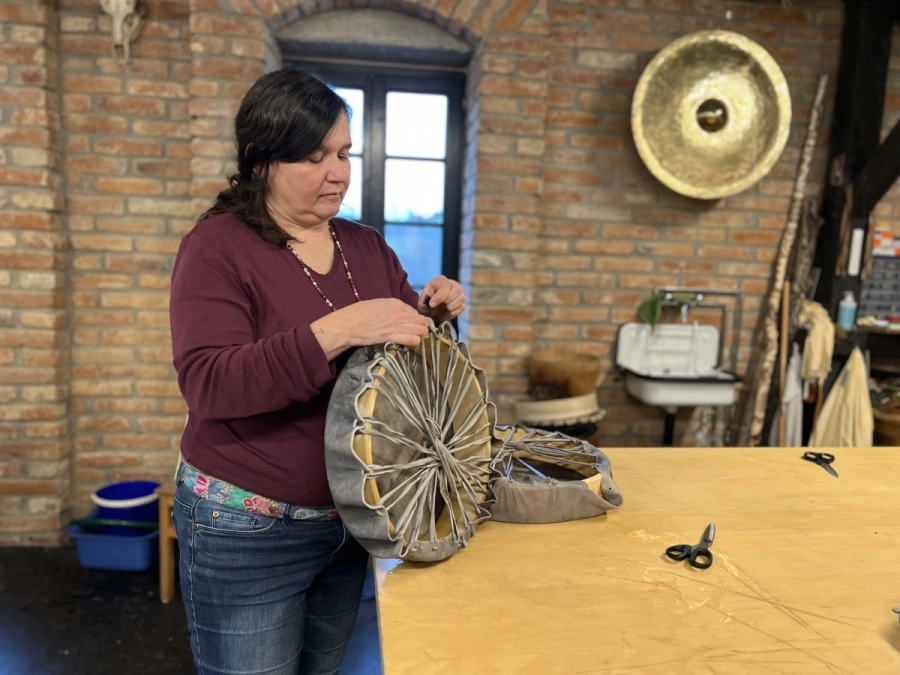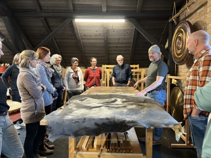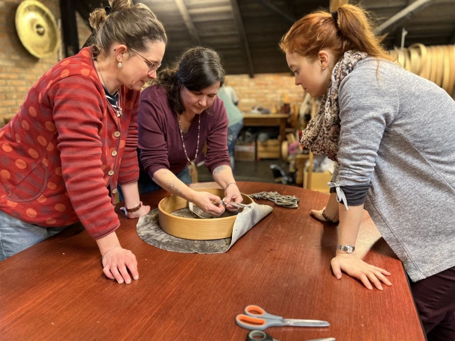 Nach einer gemütlichen Mittagspause beginnt der eigentliche Schöpfungsprozess Deiner Trommel. Du bearbeitest die Haut, schneidest die Schnüre und verbindest alles zu einem harmonischen Ganzen.