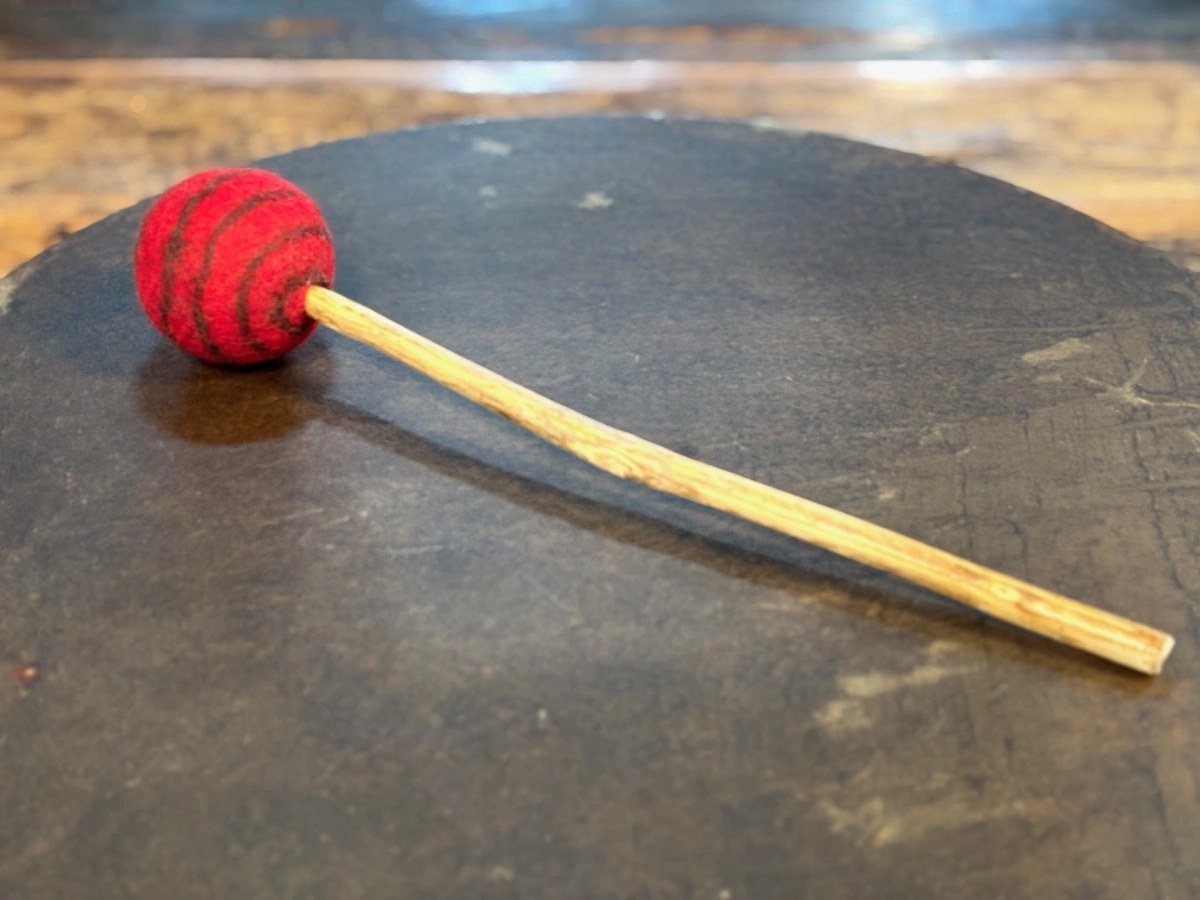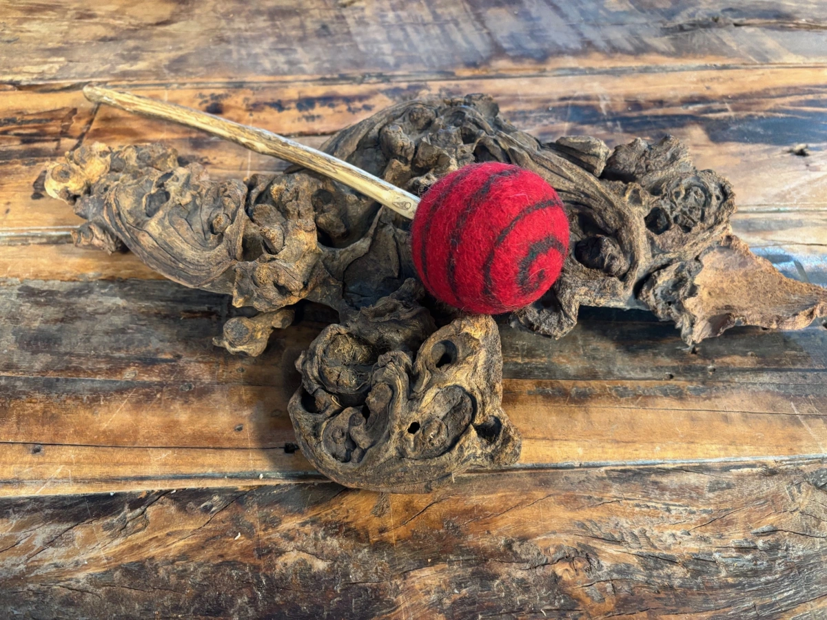 Der Filzball aus weicher Schafwolle hat einen Durchmesser von 6 cm und schenkt der Motherdrum einen warmen Trommelschlag, der tief trägt und den Raum mit einem ruhigen, erdenden Puls erfüllt. Jeder Schlag lässt die Trommel atmen, jede Bewegung entfaltet ein sanftes Beben, das Körper und Raum in Schwingung bringt.