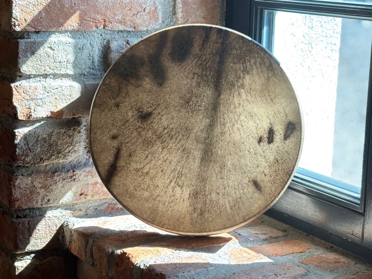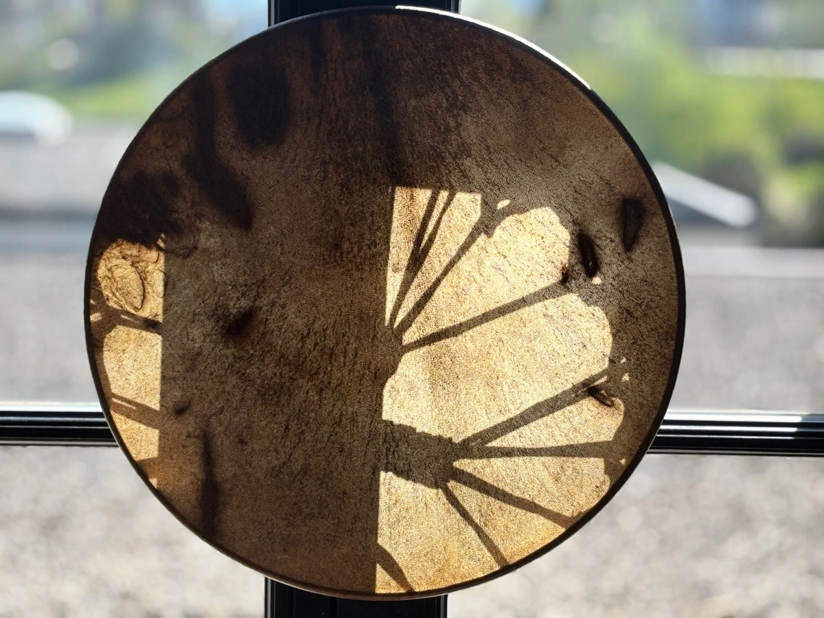 Mit 38 cm Durchmesser und einem leichten Gewicht von nur 672 g liegt sie fein und lebendig in Deiner Hand. Der Ahornrahmen trägt die gespannte Hirschhaut, aus der ein klarer, zugleich warmer Klang entsteht – sanft und doch präsent, wie ein Herzschlag, der Dich durch Deine innere Landschaft führt.