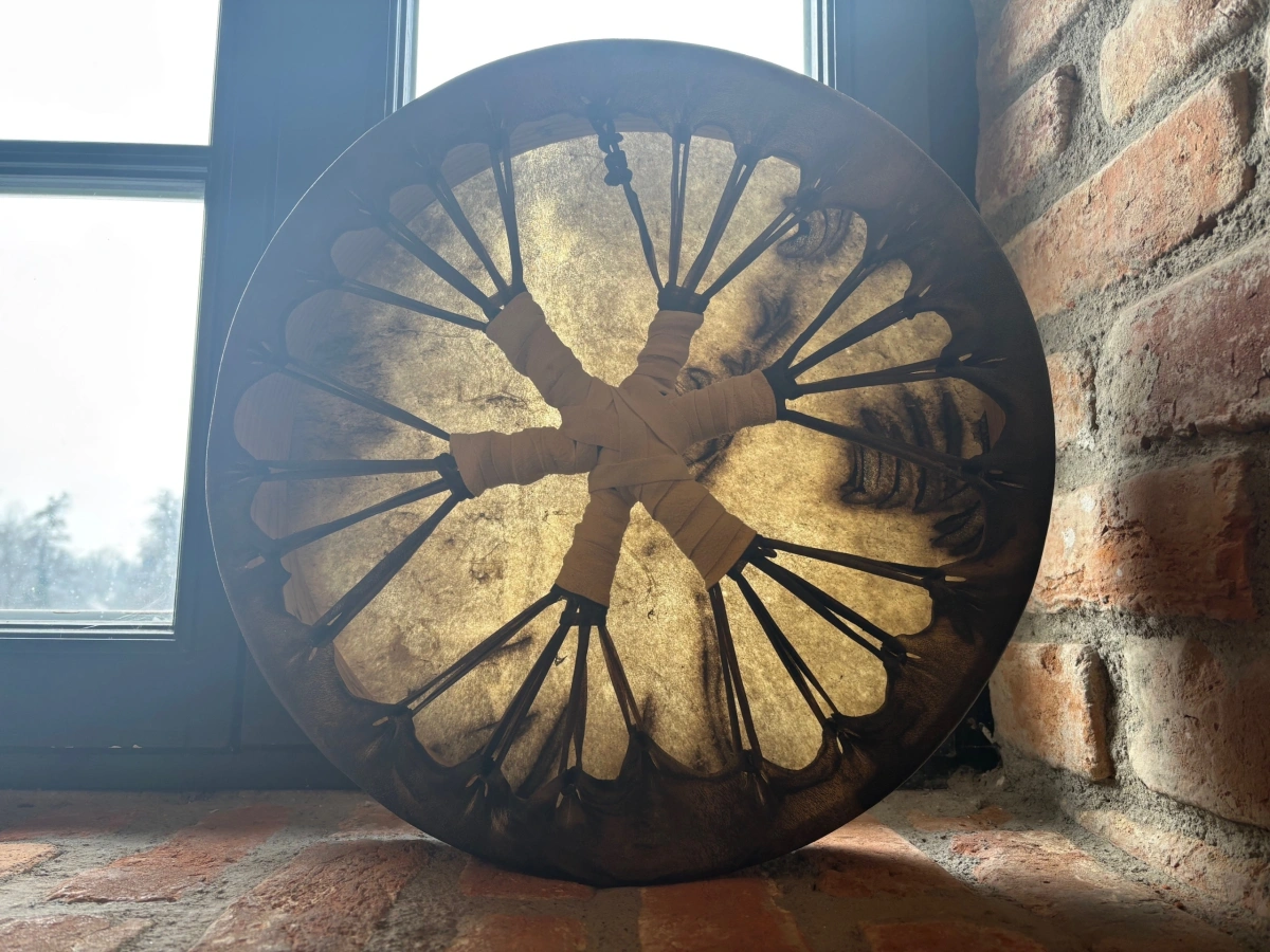 Die Hirschstierhaut steht für ruhige Stärke, Präsenz und Herzverbundenheit. Der Eschenholzrahmen unterstützt Klarheit, Aufrichtung und das Gehen neuer Wege. Mit 40 cm Durchmesser, 8 cm Tiefe und 1144 g Gewicht entfaltet sie einen warmen, tragenden Klang für Rituale, schamanische Reisen und den Start neuer Projekte.