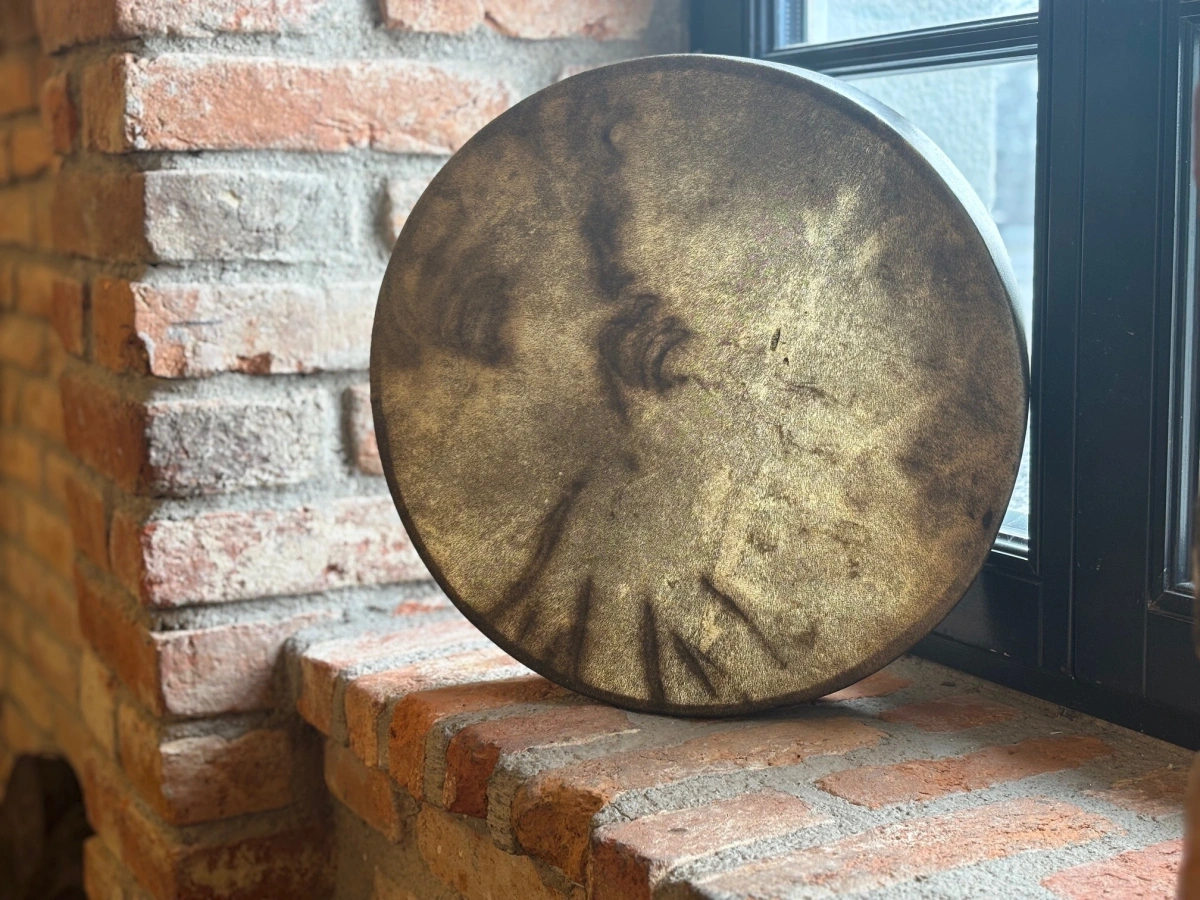 Mit 40 cm Durchmesser, 8 cm Tiefe und einem Gewicht von 1144 g liegt die Trommel ausgewogen und ruhig in den Händen. Ihr Klang ist warm, tief und tragend – erdend im Fundament und offen im Herzraum.