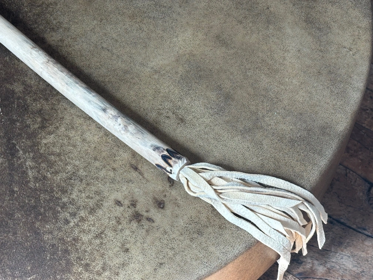 Dieser Trommelstock verkörpert das männliche Prinzip zur weiblichen Trommel – Träger Deiner Absicht und Impulsgeber für den Klang. Das Holunderholz, die feine Brandverzierung und der Lederklöppel verbinden sich zu einem klaren, erdigen Anschlag. Die Lederfransen bringen Bewegung und Leichtigkeit in Dein Spiel. Ein kraftvoller Begleiter für Rituale und schamanische Arbeit.