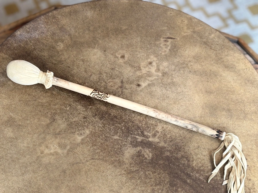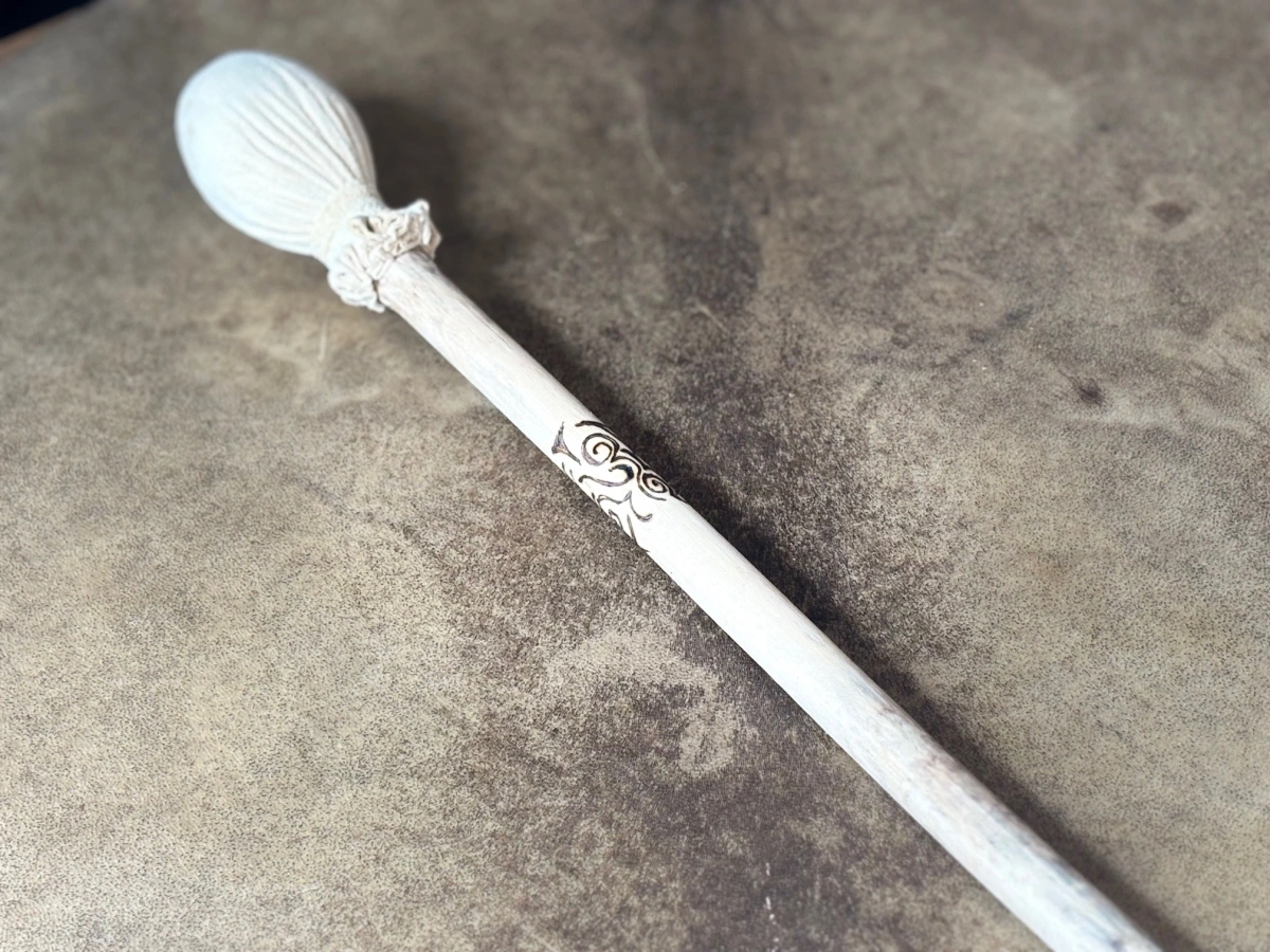 Dieser Trommelstock trägt die klare, gerichtete Kraft des männlichen Prinzips in sich. Als Gegenstück zur weiblichen Trommel wird er zum Träger Deiner Absicht – er gibt den Impuls, setzt den Rhythmus und bringt Deine Intention in Bewegung.