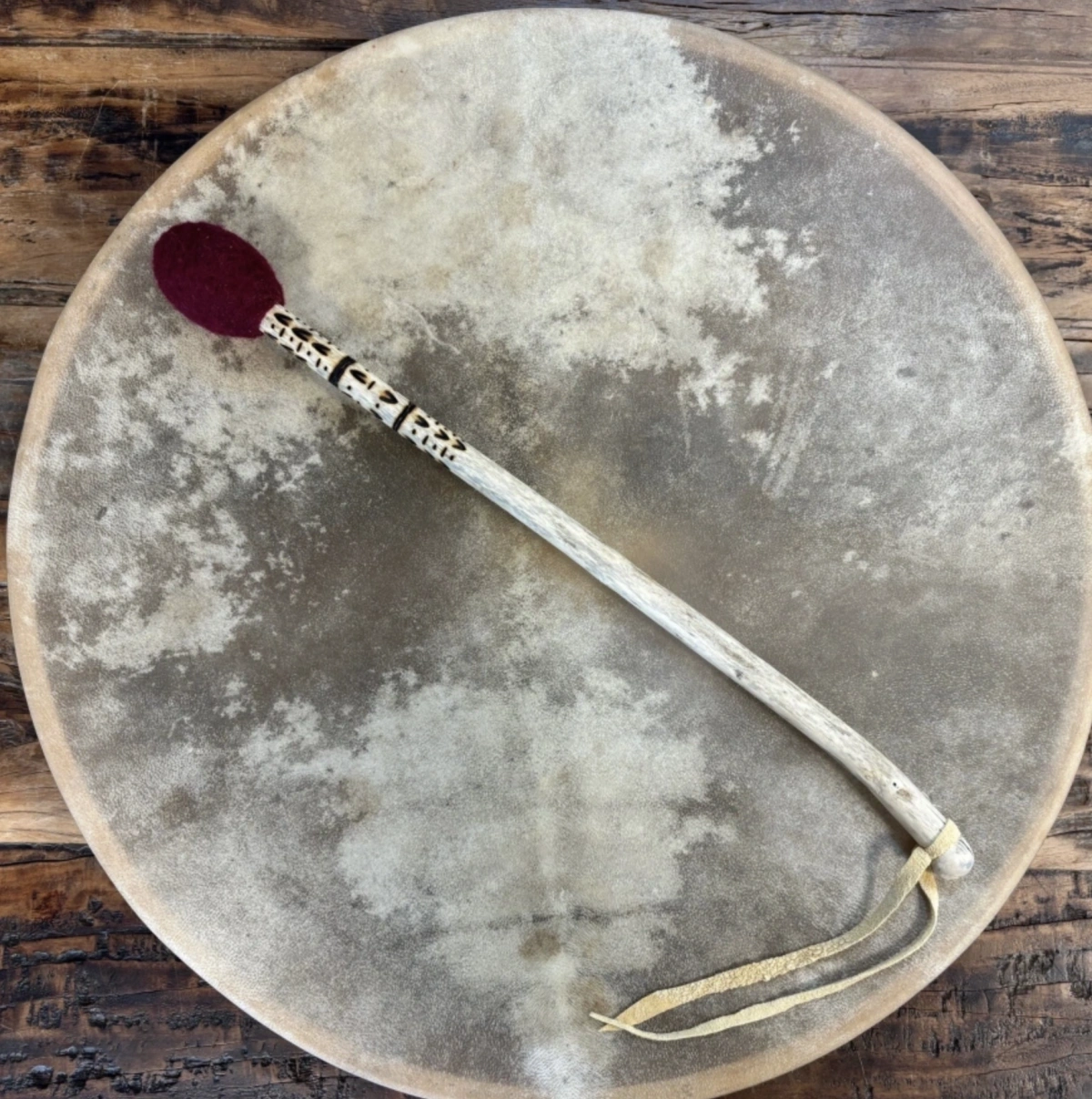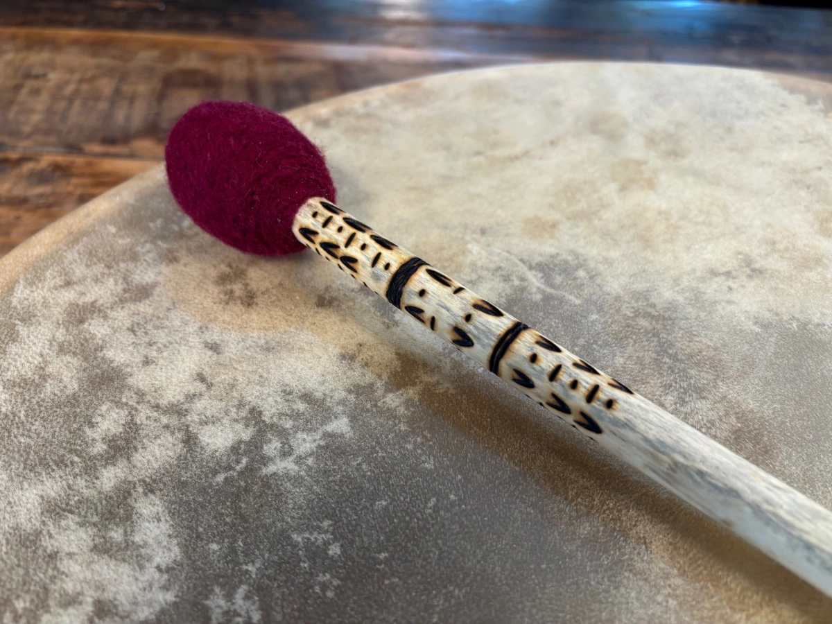 Das Holz ist mit einer zarten Brandmuster-Verzierung geschmückt, die seine natürliche Schönheit betont und jedes Stück zu einem Unikat macht. In seiner Schlichtheit und Klarheit lädt dieser Trommelstock dazu ein, mit Achtsamkeit und Herz zu spielen – in Ritualen, Klangreisen oder stillen Momenten der Einkehr.