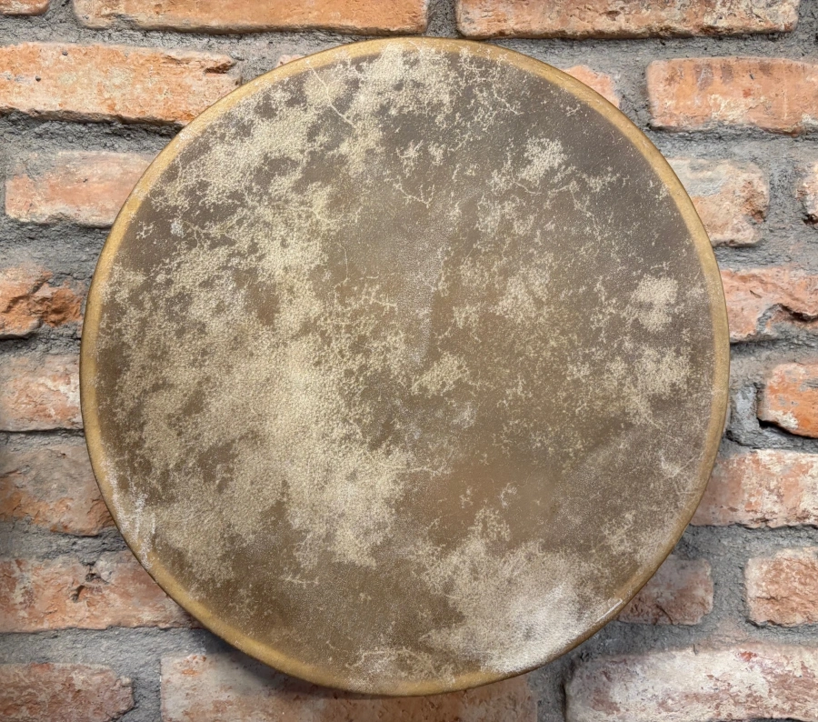 Besonders liebevoll gefertigt ist der Griff aus kunstvoll gebundener Rohhaut, der Stabilität mit natürlicher Eleganz verbindet. Jede Trommel ist ein Unikat – die Kombination aus heller Haut, feiner Handwerkskunst und ausgewogenem Klang macht sie zu einem treuen Begleiter für Rituale, Klangreisen und meditative Momente.