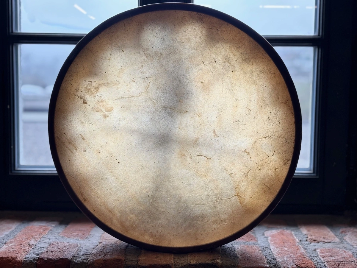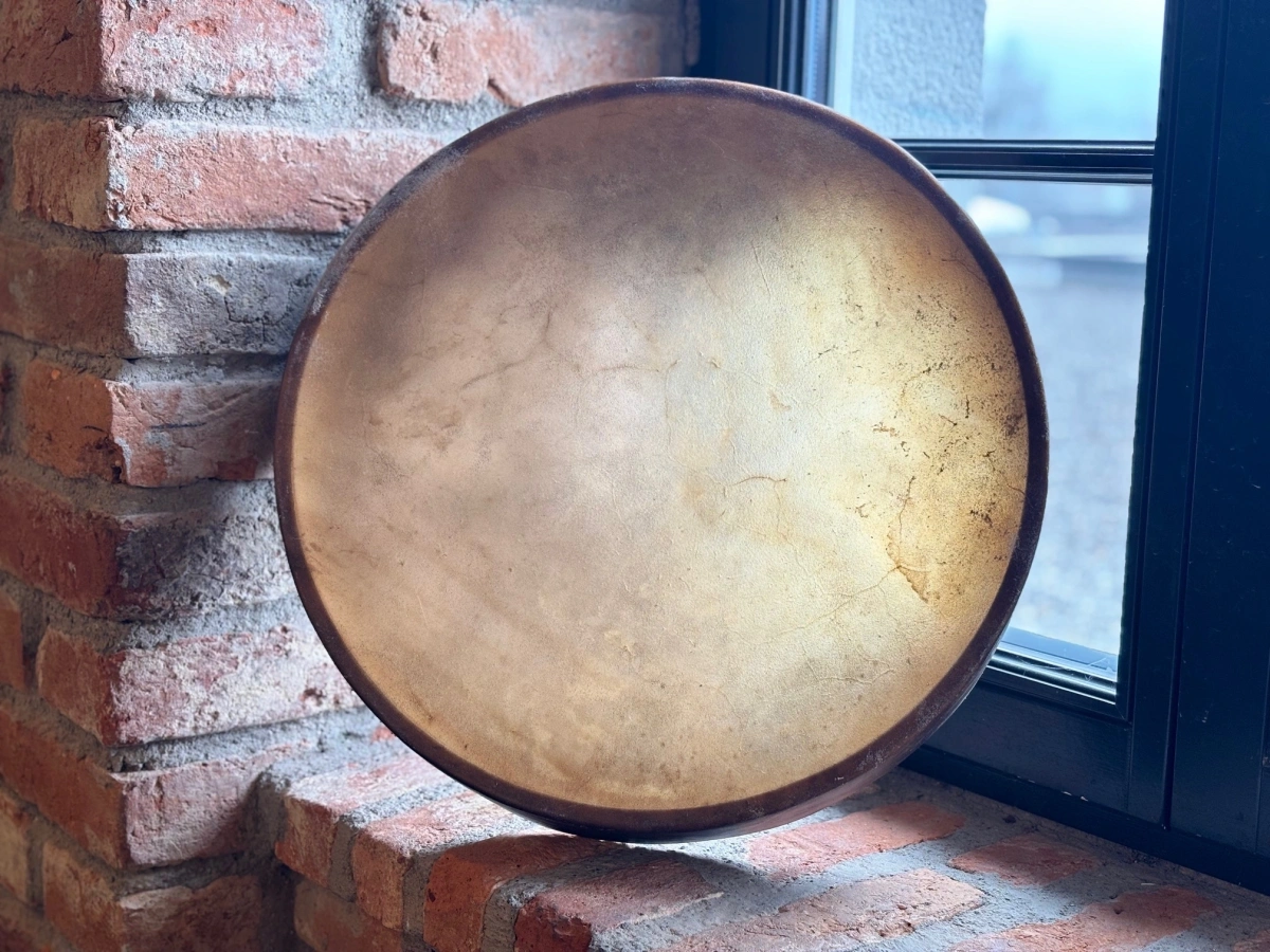 Die dunkel gemusterte Pferdehaut verleiht der Trommel eine besondere Tiefe und Ausdruckskraft. Ihre natürliche Zeichnung macht jedes Stück einzigartig. Mit einem Durchmesser von 46 cm und einem Gewicht von 1714 g besitzt sie eine kraftvolle Präsenz und zugleich eine ruhige, tragende Schwingung.