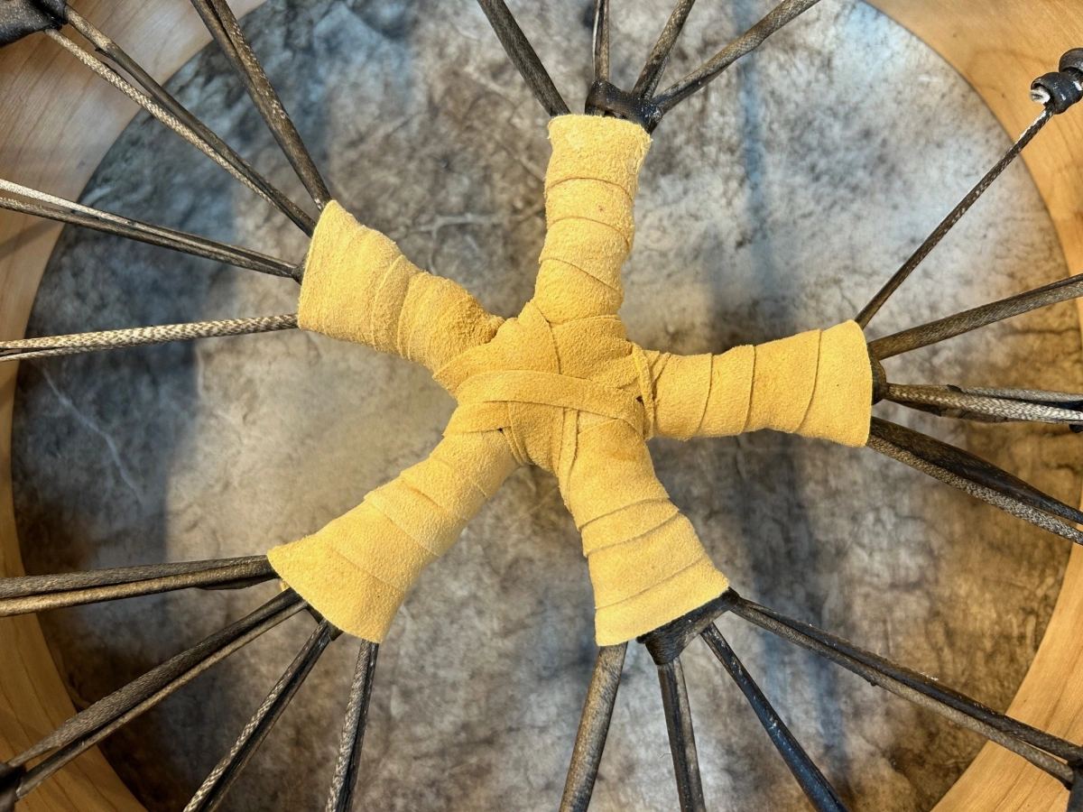 Die natürlich behandelte Hirschhaut entfaltet einen warmen, erdverbundenen Klang von sanft bis kraftvoll und eignet sich für Meditation, Rituale und Klangreisen. Der mit sämisch gegerbtem Schafleder umwickelte Griff unterstützt ein ruhiges, intuitives Spielgefühl.