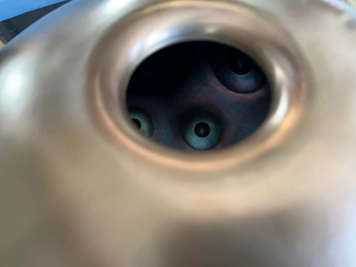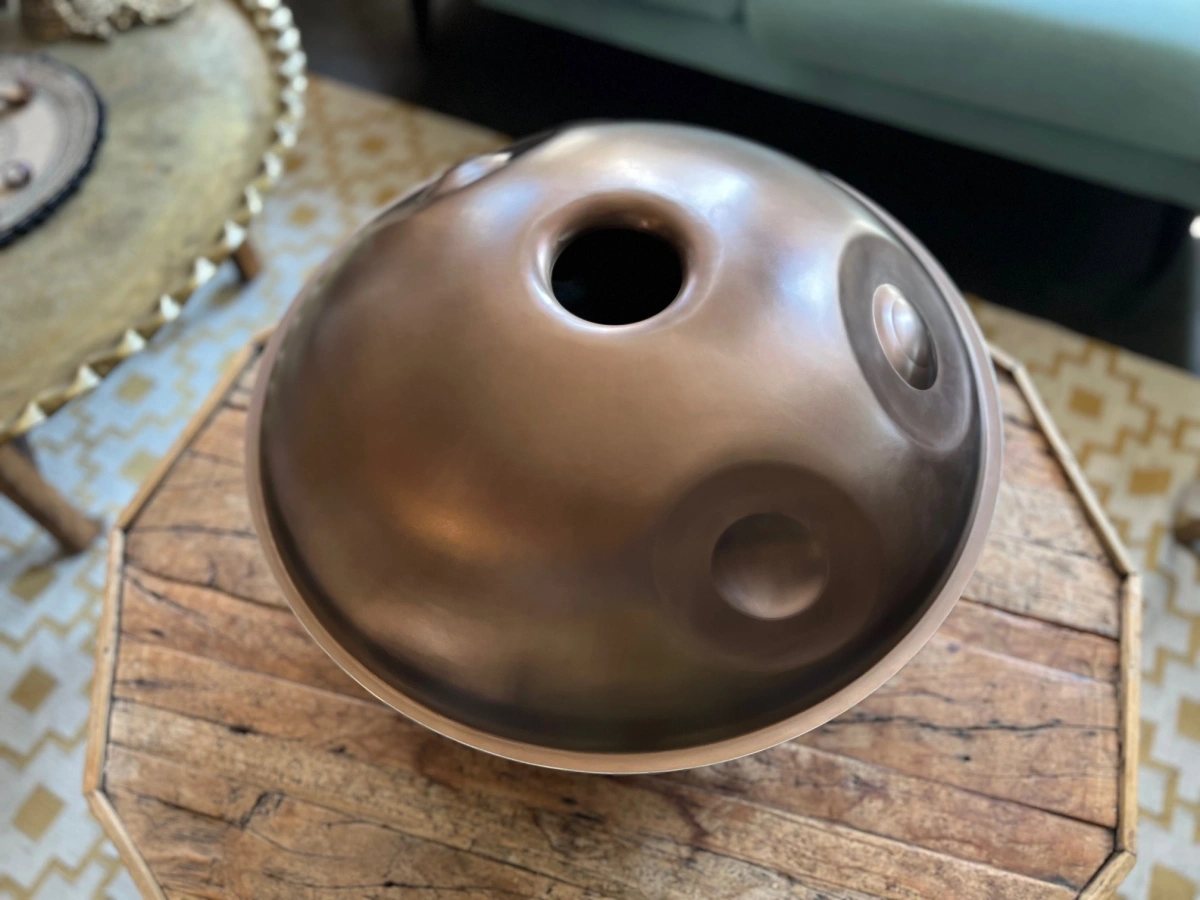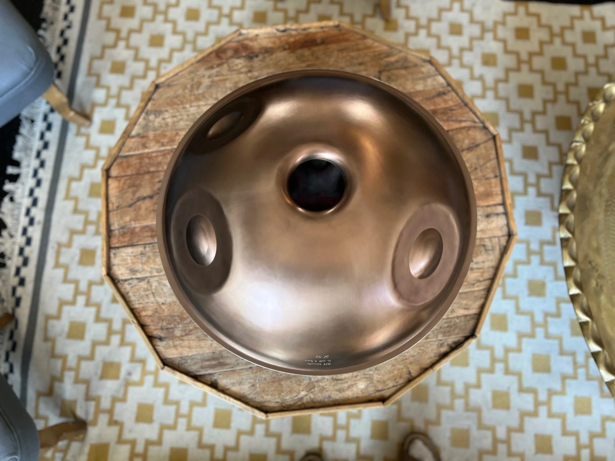 Handgefertigte Edelstahl-Handpan mit offener, ruhiger Stimmung, tiefer Erdung, langem Sustain und fliessendem Klang – ideal für Meditation und Klangreisen.