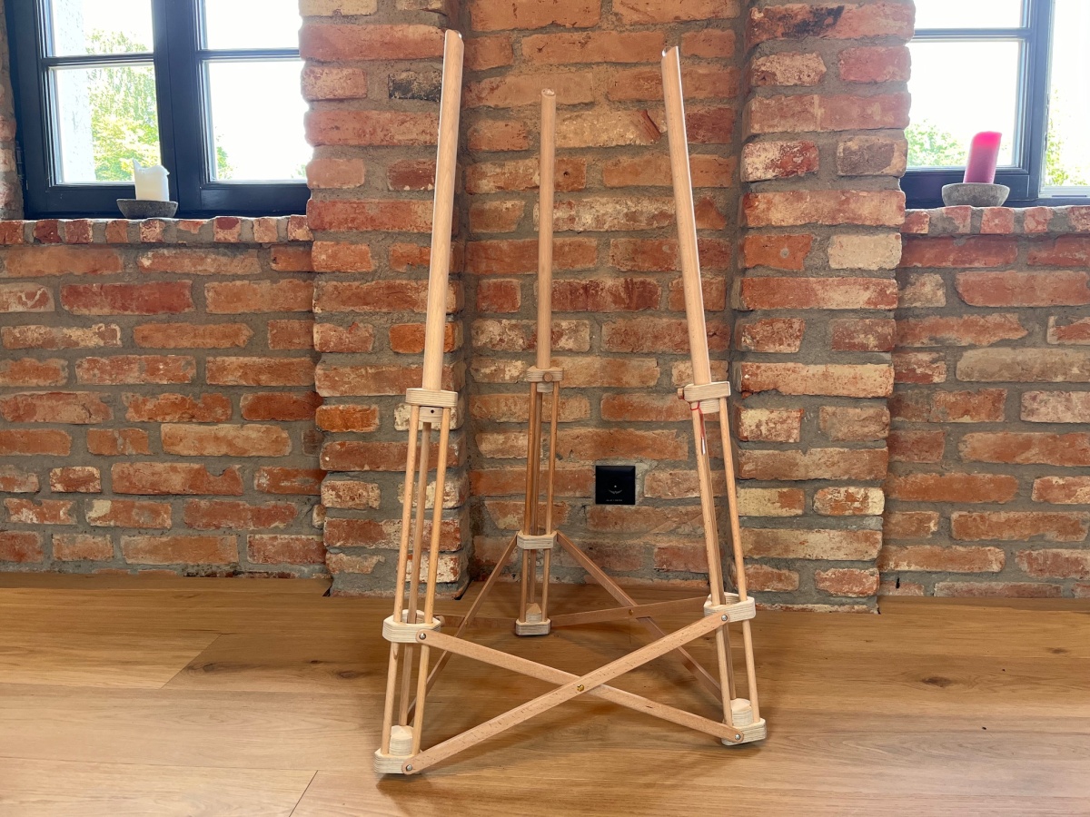 Zusammengeklappt ist der Ständer nur 20 x 16 cm gross und 55 cm hoch. Er wird in einem praktischen Baumwollbeutel mit Kordelzug geliefert und wiegt nur 1,5 kg – perfekt für Transport, Workshops oder Bühnenauftritte.