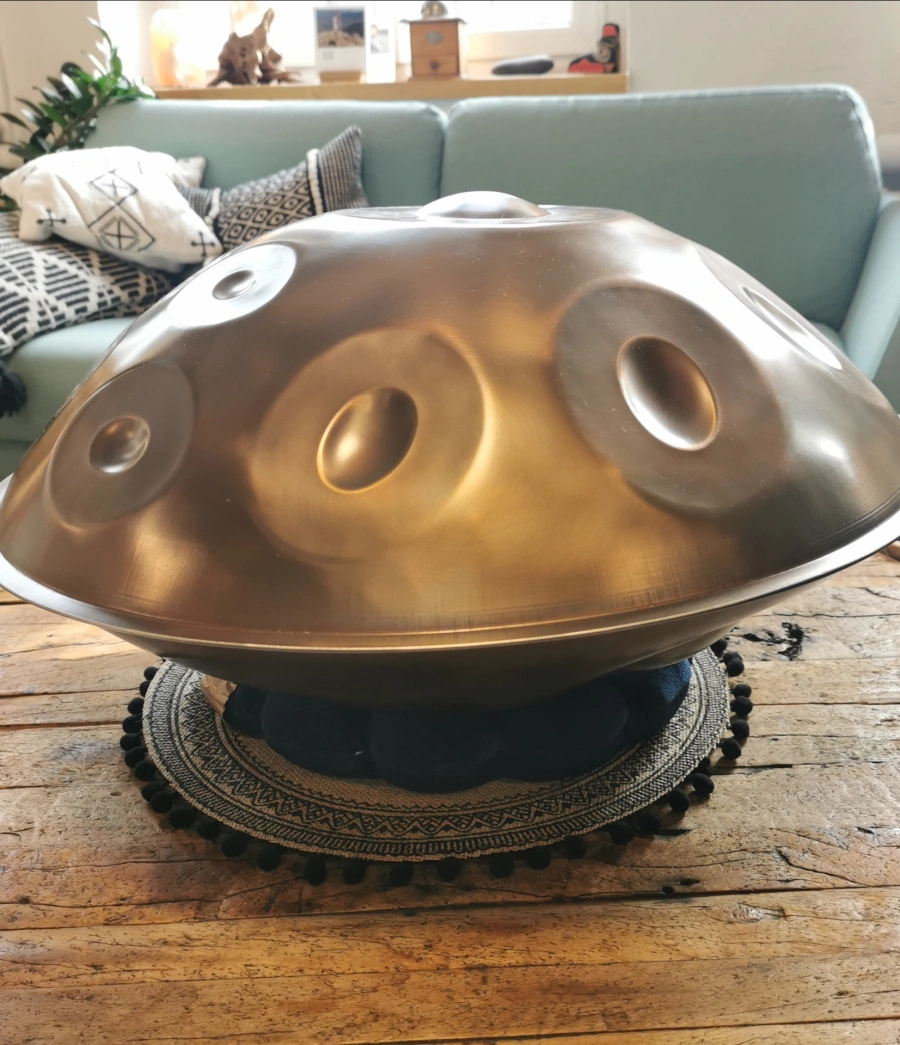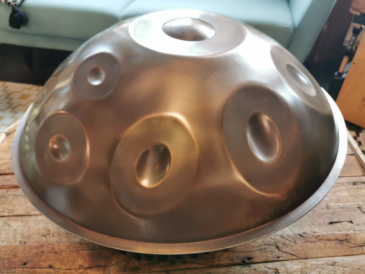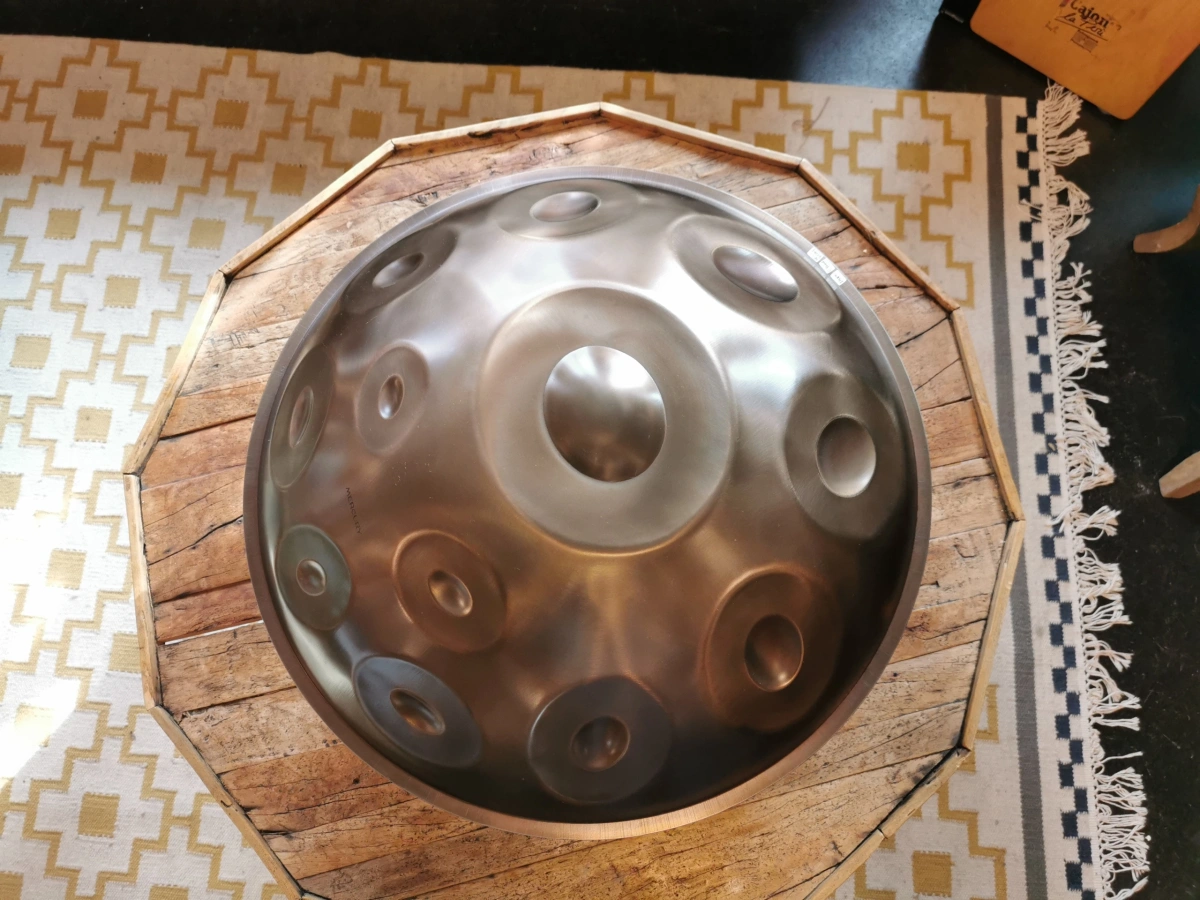 Entdecke die D Kurd Handpan aus Edelstahl mit 14 Tonfeldern. Warm klingend, mit orientalischem Flair, perfekt für kreative Improvisationen und ruhige Sessions.