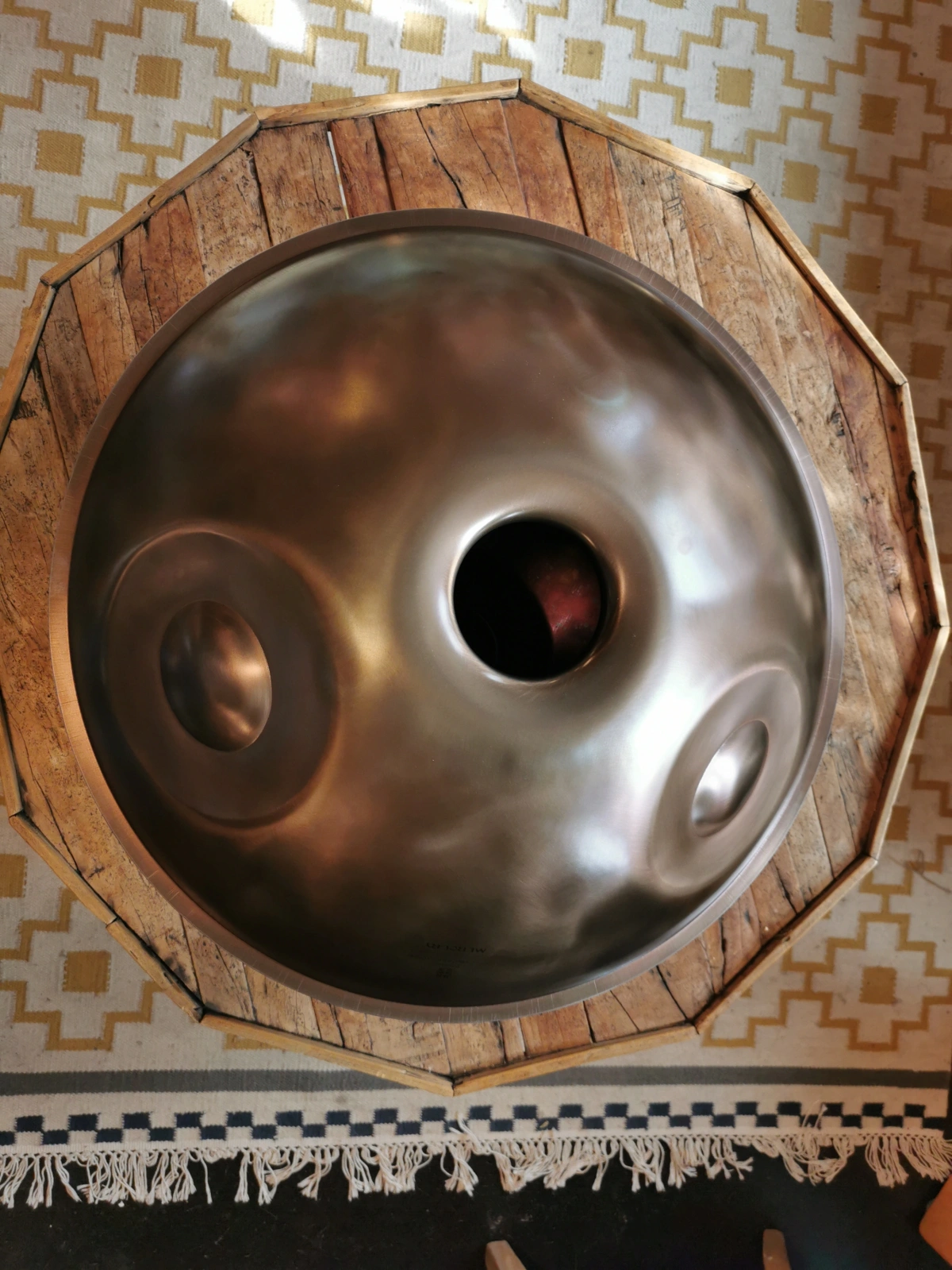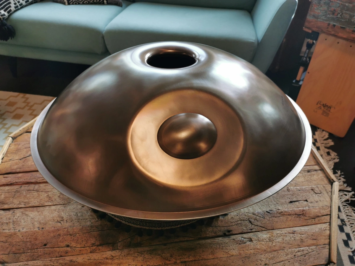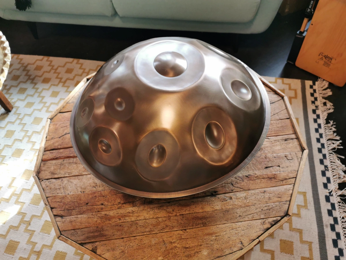 Entdecke die D Kurd Handpan aus Edelstahl mit 14 Tonfeldern. Warm klingend, mit orientalischem Flair, perfekt für kreative Improvisationen und ruhige Sessions.