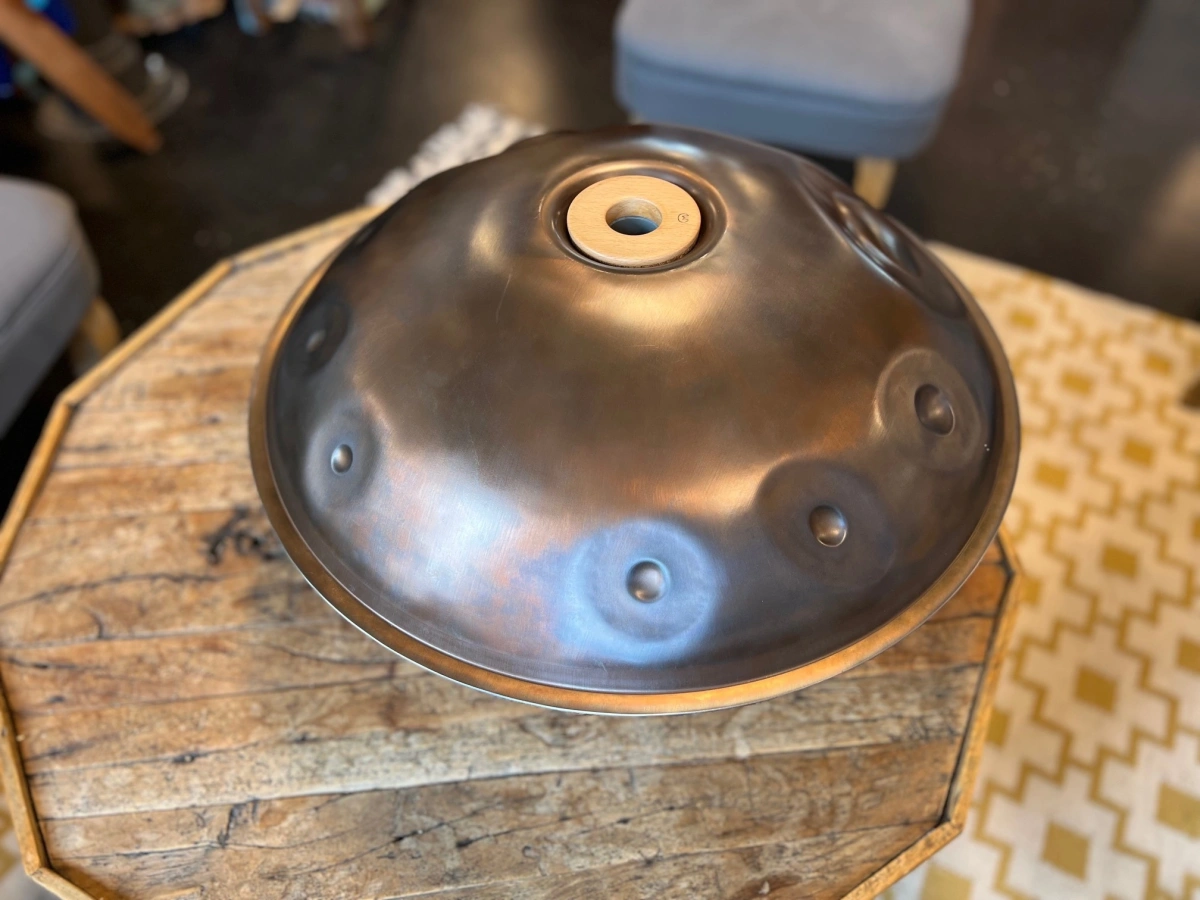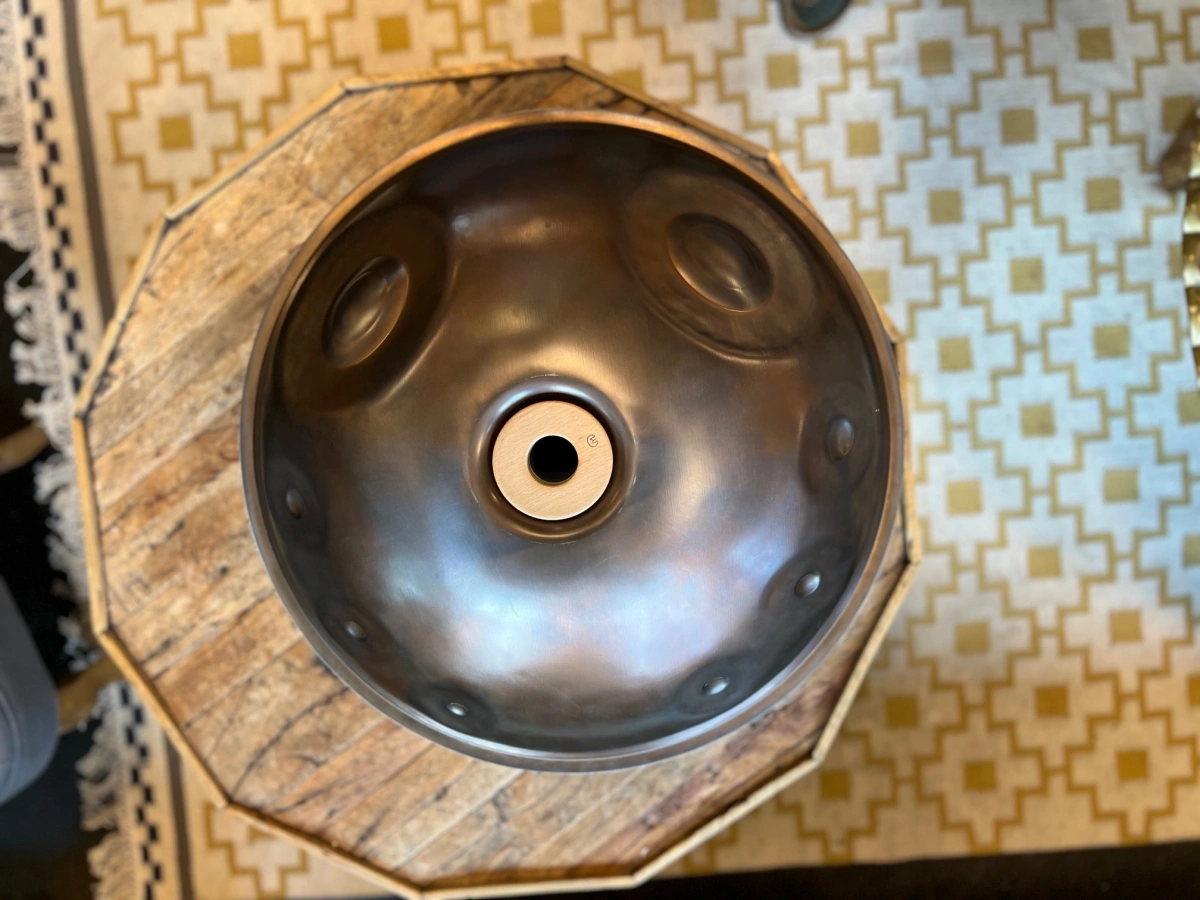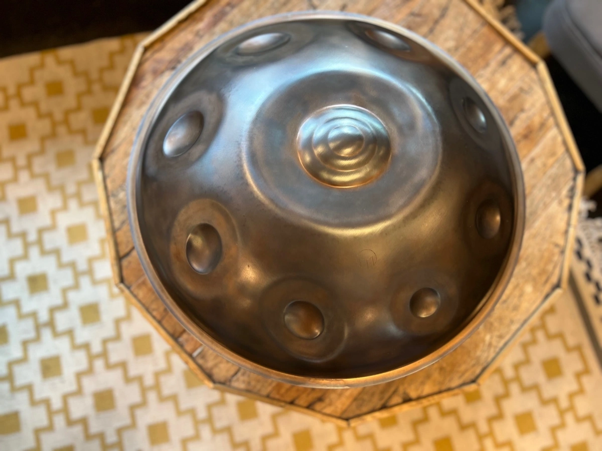 Diese Handpan stammt aus der Privatsammlung von Thomas und zeichnet sich durch einen besonders satten Bass sowie ausgeprägte Bending-Möglichkeiten aus, die das modulare Spiel der Klangfelder erweitern und kreative Ausdrucksformen erlauben.
