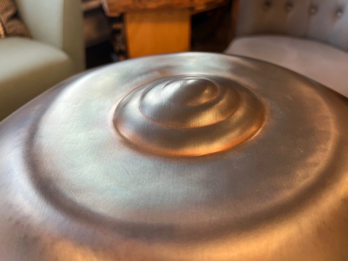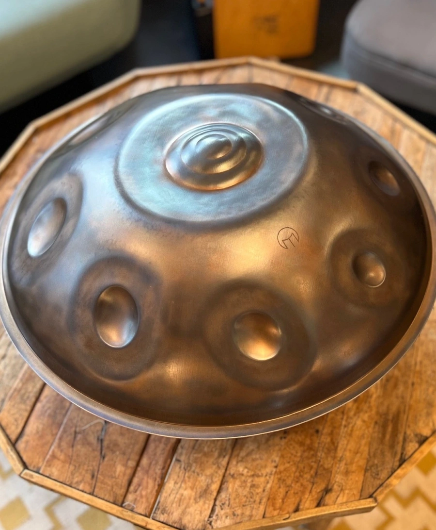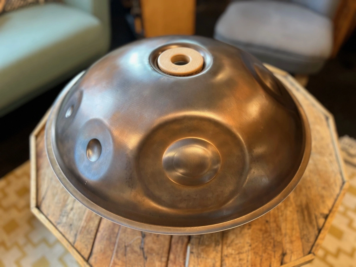Diese Handpan stammt aus der Privatsammlung von Thomas und zeichnet sich durch einen besonders satten Bass sowie ausgeprägte Bending-Möglichkeiten aus, die das modulare Spiel der Klangfelder erweitern und kreative Ausdrucksformen erlauben.