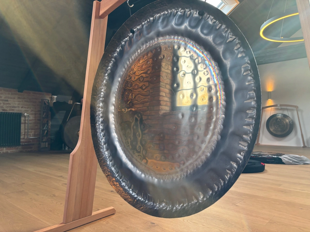 Der Gong ist auf 128 Hz (C3) gestimmt, mit A4 = 430,54 Hz, leicht unter dem internationalen Standard, wodurch der Klang wärmer und sanfter wirkt. Da der Gong eine Oktave tiefer vibriert, liegt der tragende Grundton bei 64 Hz (C2), was eine erdende, tief resonierende Klangbasis erzeugt.