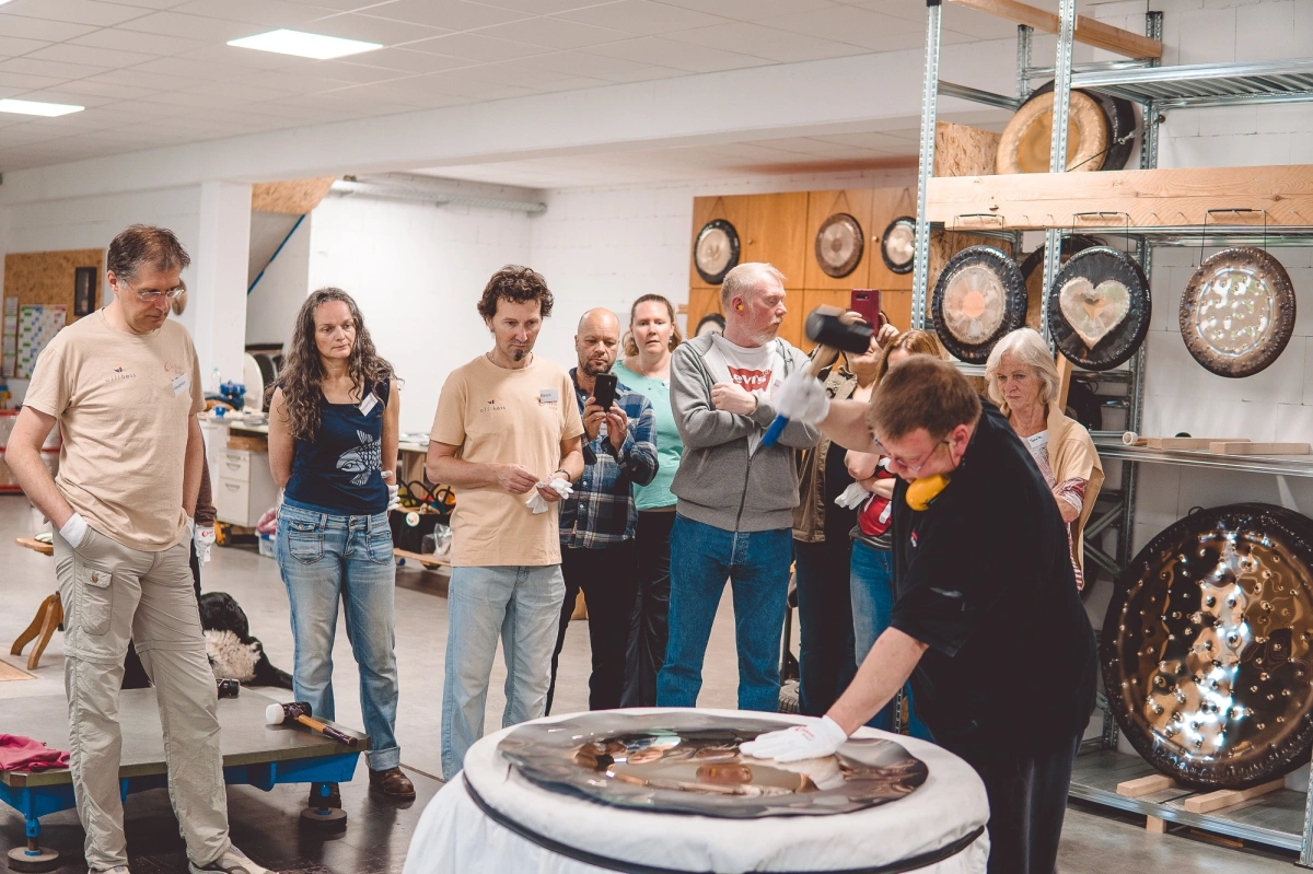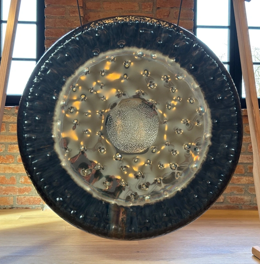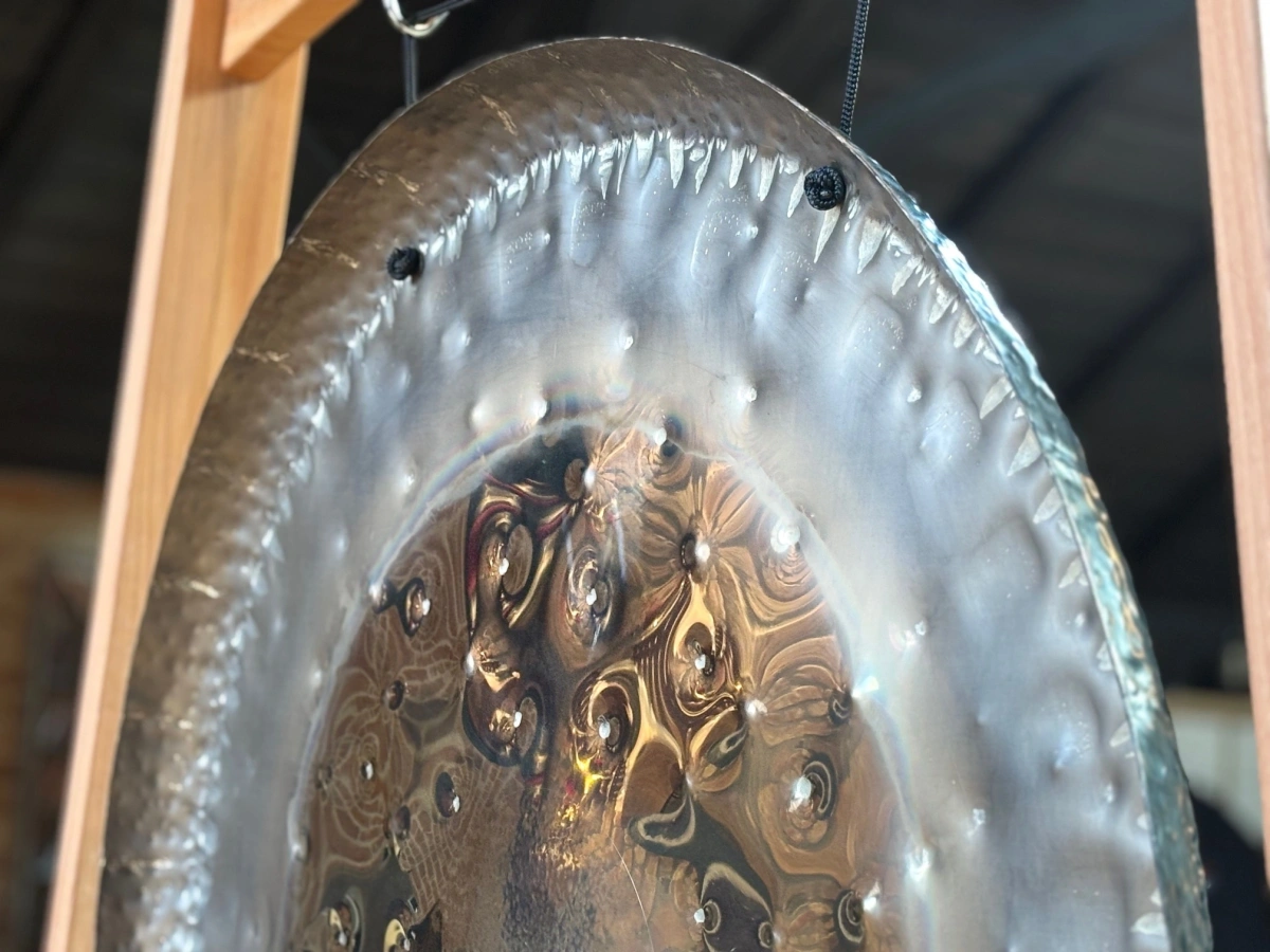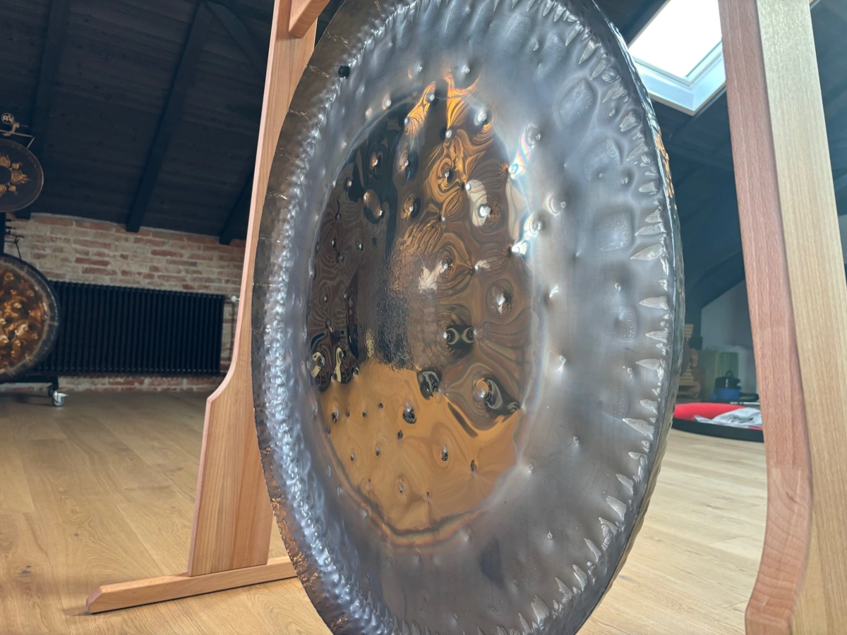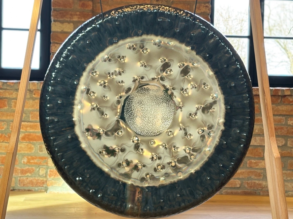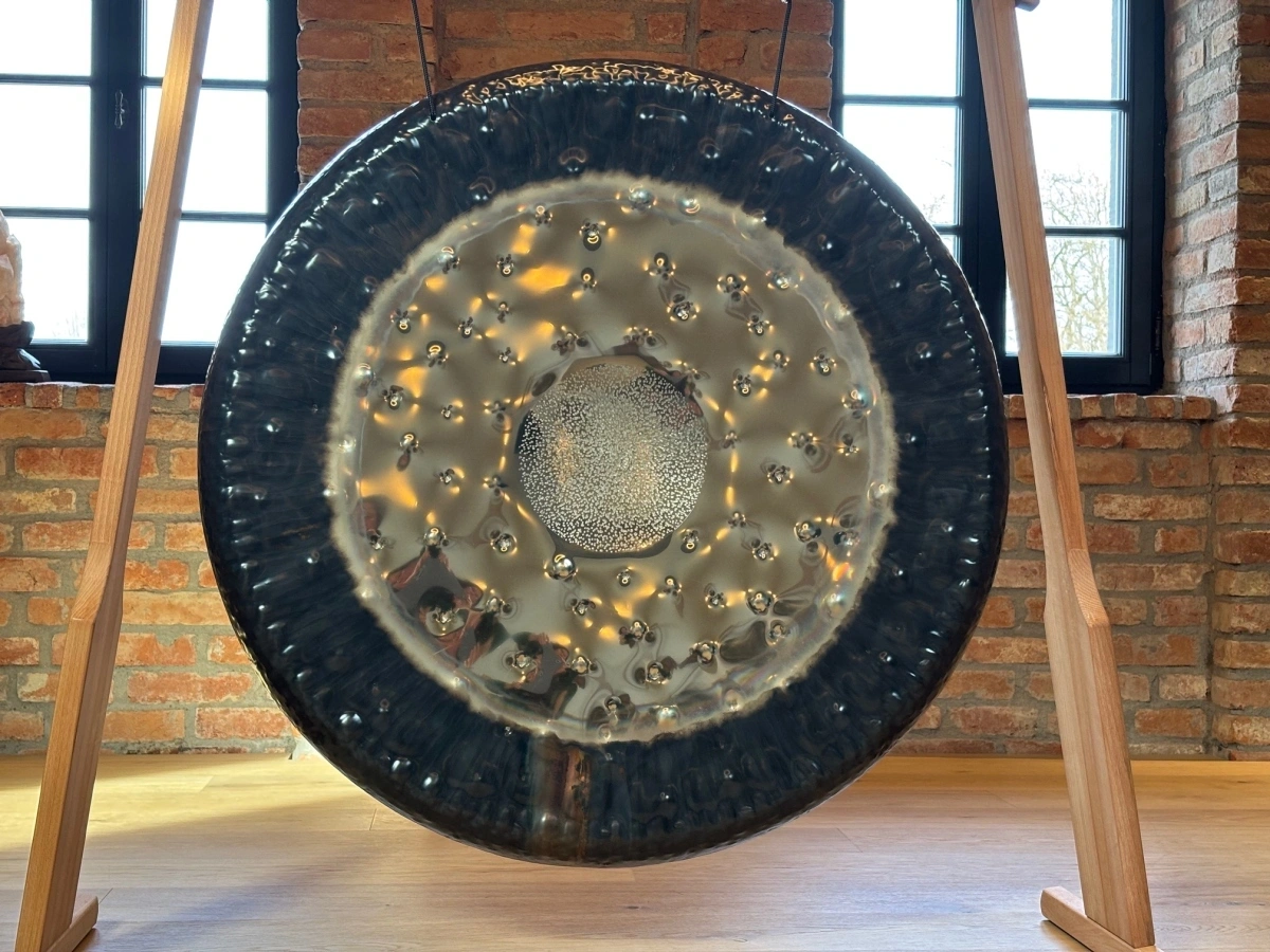 Jeder Gong ist ein Unikat – leichte Abweichungen in Form, Durchmesser oder Oberfläche sind normal und unterstreichen die individuelle Handarbeit. Die sichtbaren Hammerschläge zeugen von der sorgfältigen Fertigung und sind gleichzeitig ein Qualitätsmerkmal. Durch Material, Grösse und Form erzeugt der Gong eine intensive, harmonische Schwingung, die Körper, Geist und Sinne gleichermassen berührt.