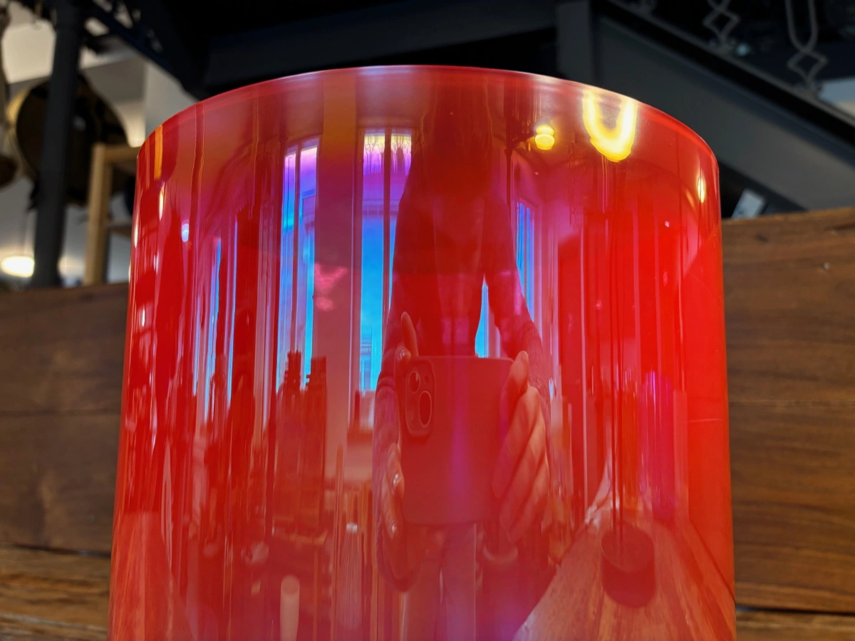Die Basis jeder Schale ist hochreiner Quarzsand mit 99,99 % Siliziumdioxid. Bei über 2000 °C schmilzt das Material und wird in präzise Formen gegossen. Anders als bei frei geblasenem Glas entsteht jede Schale in einem kontrollierten technischen Prozess. Maschinen formen die Rohlinge, doch die eigentliche Kunst liegt im Feinschliff der Ränder. Jeder minimale Abtrag verändert die Tonhöhe, bis Grundton, Obertöne und Schwingungsverhalten perfekt harmonieren.
