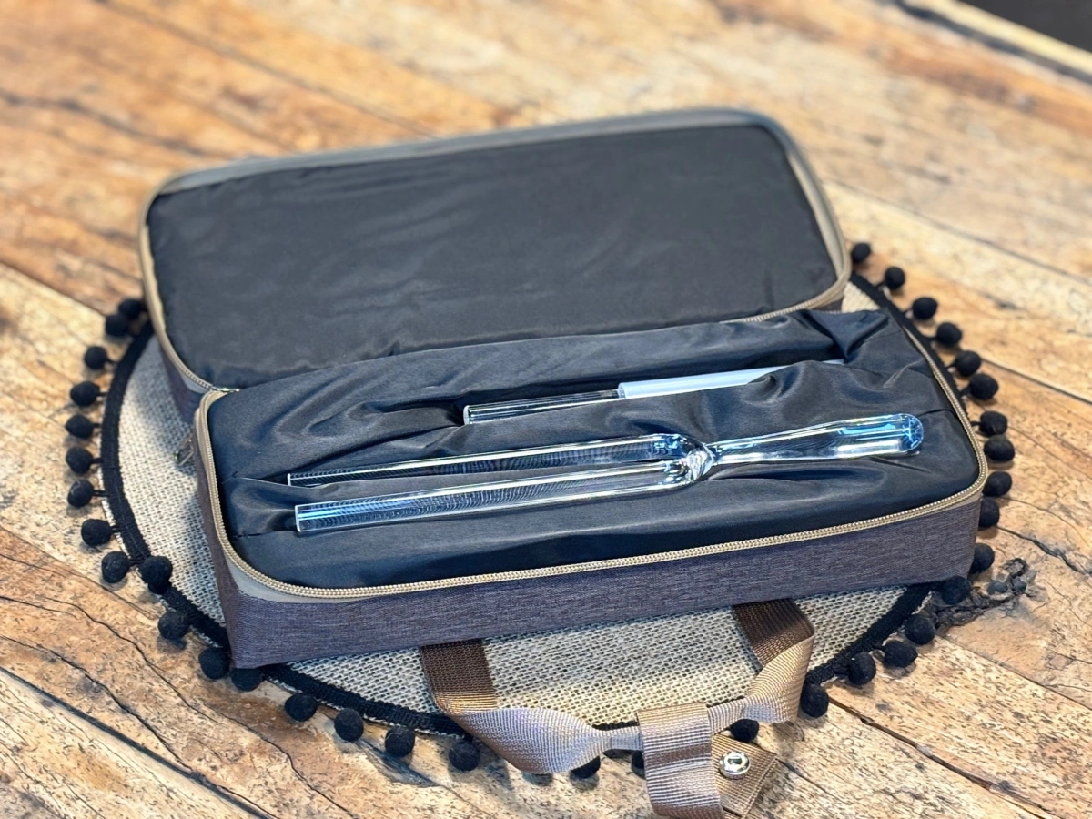 Gefertigt aus Kristallglas, trägt diese Stimmgabel eine besonders klare, feine und obertonreiche Klangqualität. Mit einem Gewicht von 81 g und einer Länge von 26 cm liegt sie angenehm in der Hand und lässt sich präzise und intuitiv einsetzen – sei es in der direkten Körperarbeit, im Energiefeld oder als feiner Impuls in Klangreisen.