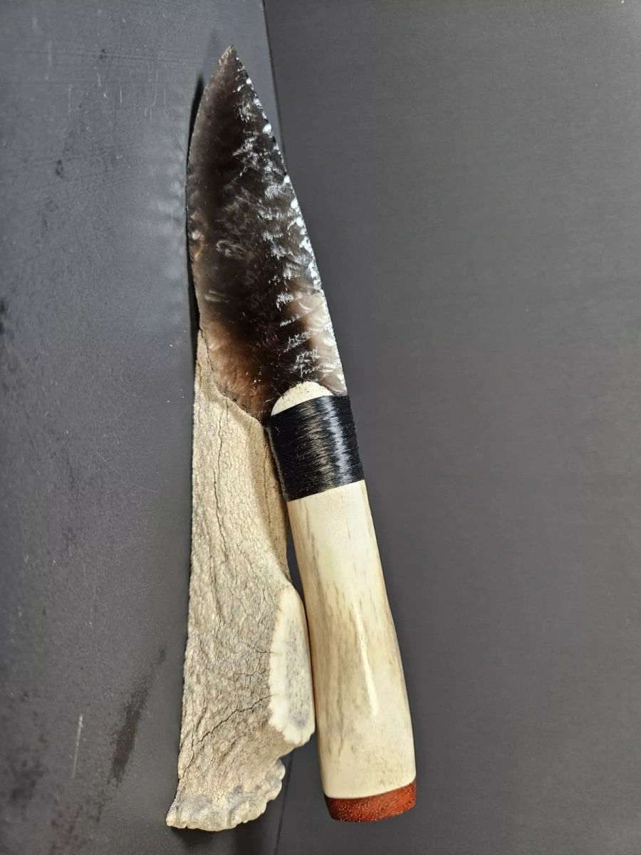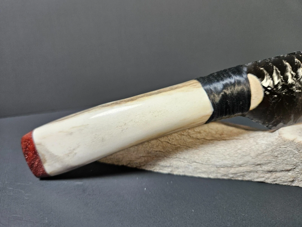 Handgefertigtes Obsidianmesser von Kenny Hull mit poliertem Hirschhorngriff und grau-schwarzer Klinge, ein signiertes Unikat (2025) in traditioneller Flintknapping-Technik, perfekt für Sammler, rituelle Anwendungen und als ästhetisches Sammlerstück.