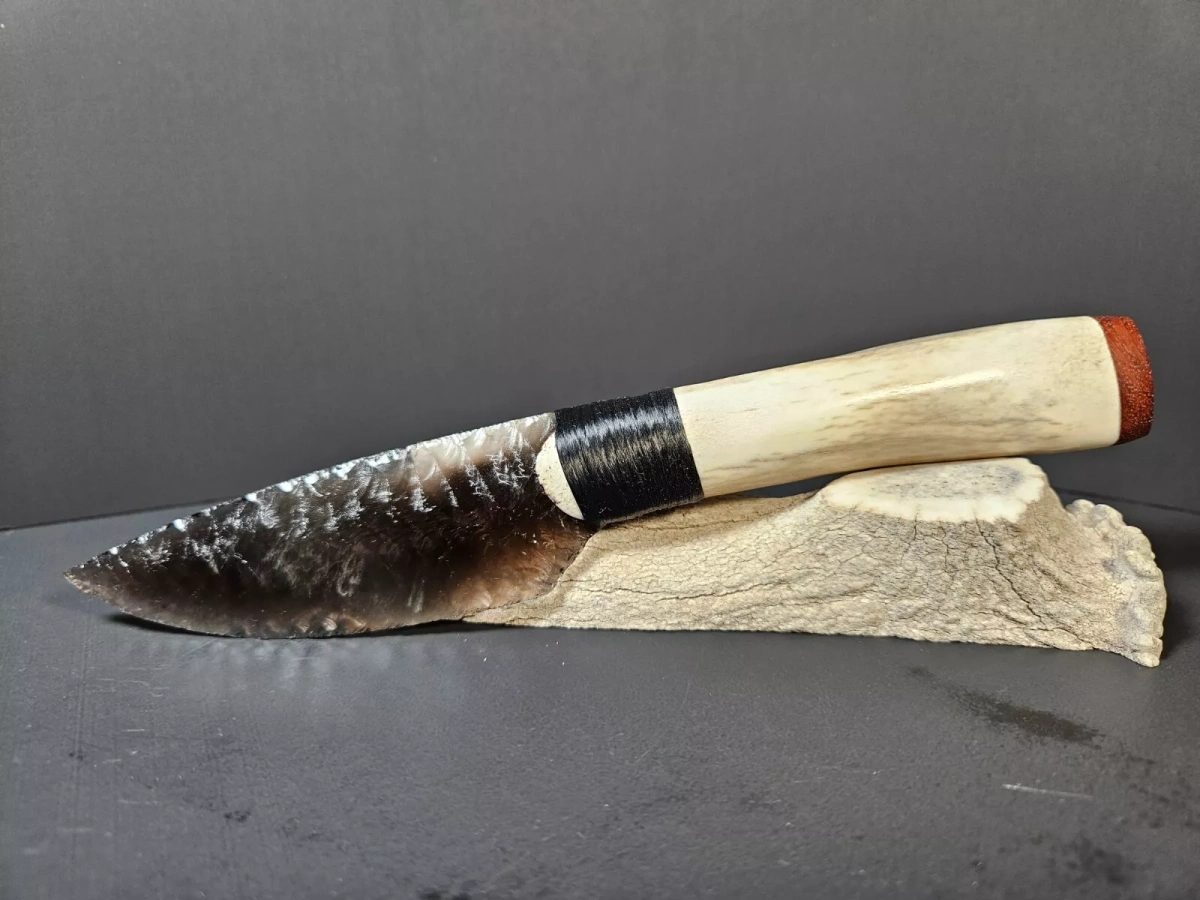 Der polierte Hirschhorngriff verbindet natürliche Materialien mit edler Verarbeitung und liegt angenehm in der Hand. Die Klinge wurde in der traditionellen Flintknapping-Technik gefertigt – eine alte Kunst, die Geduld, Präzision und jahrzehntelange Erfahrung erfordert. Jede Kerbung entlang der Schneide zeigt die Hingabe, mit der Kenny Hull seit 1995 arbeitet.