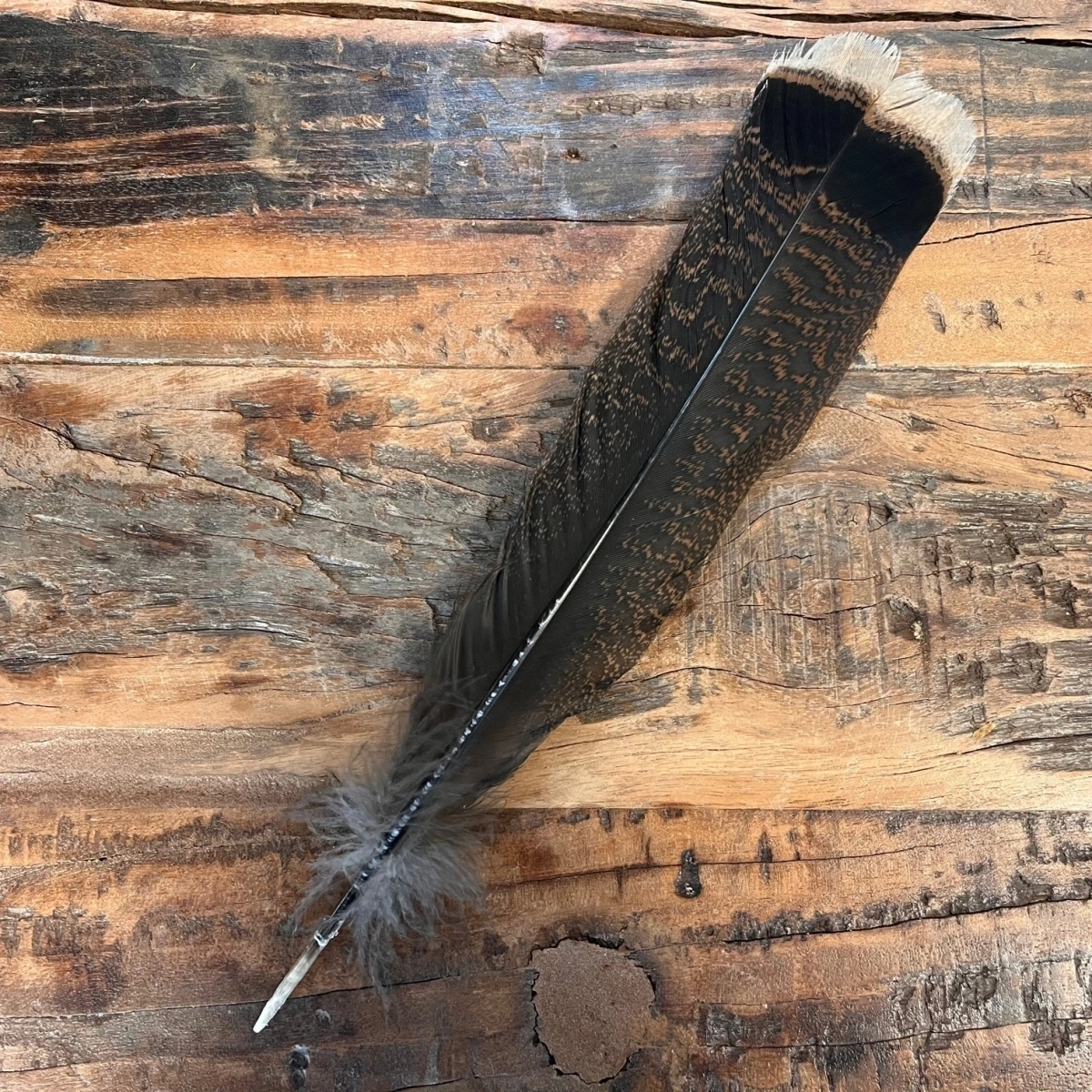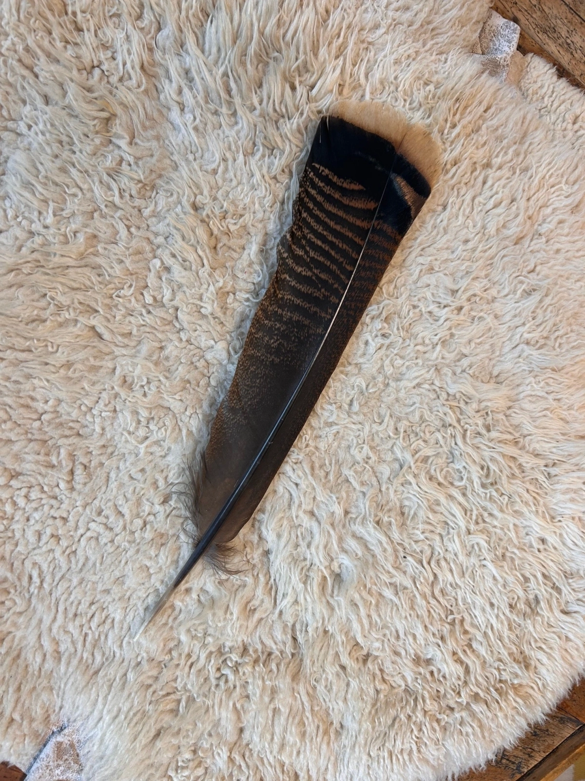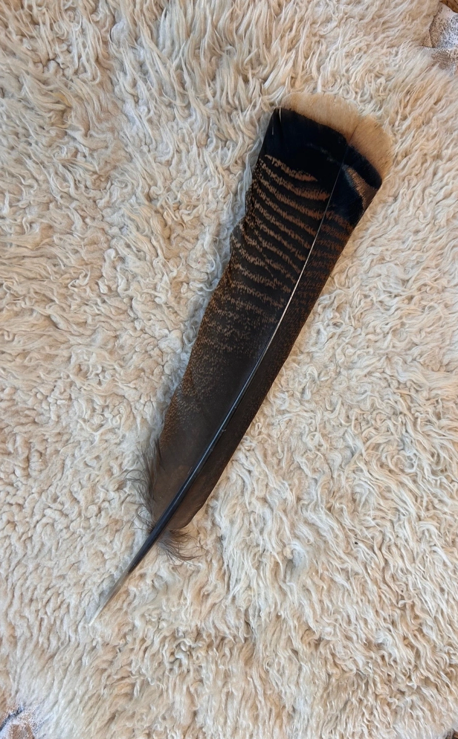 Grosse, naturbelassene Schwanzfeder vom wilden Truthahn, einzigartig in Länge und Zeichnung. Ideal als Räucherfeder, für Rituale oder als dekoratives Naturstück.
