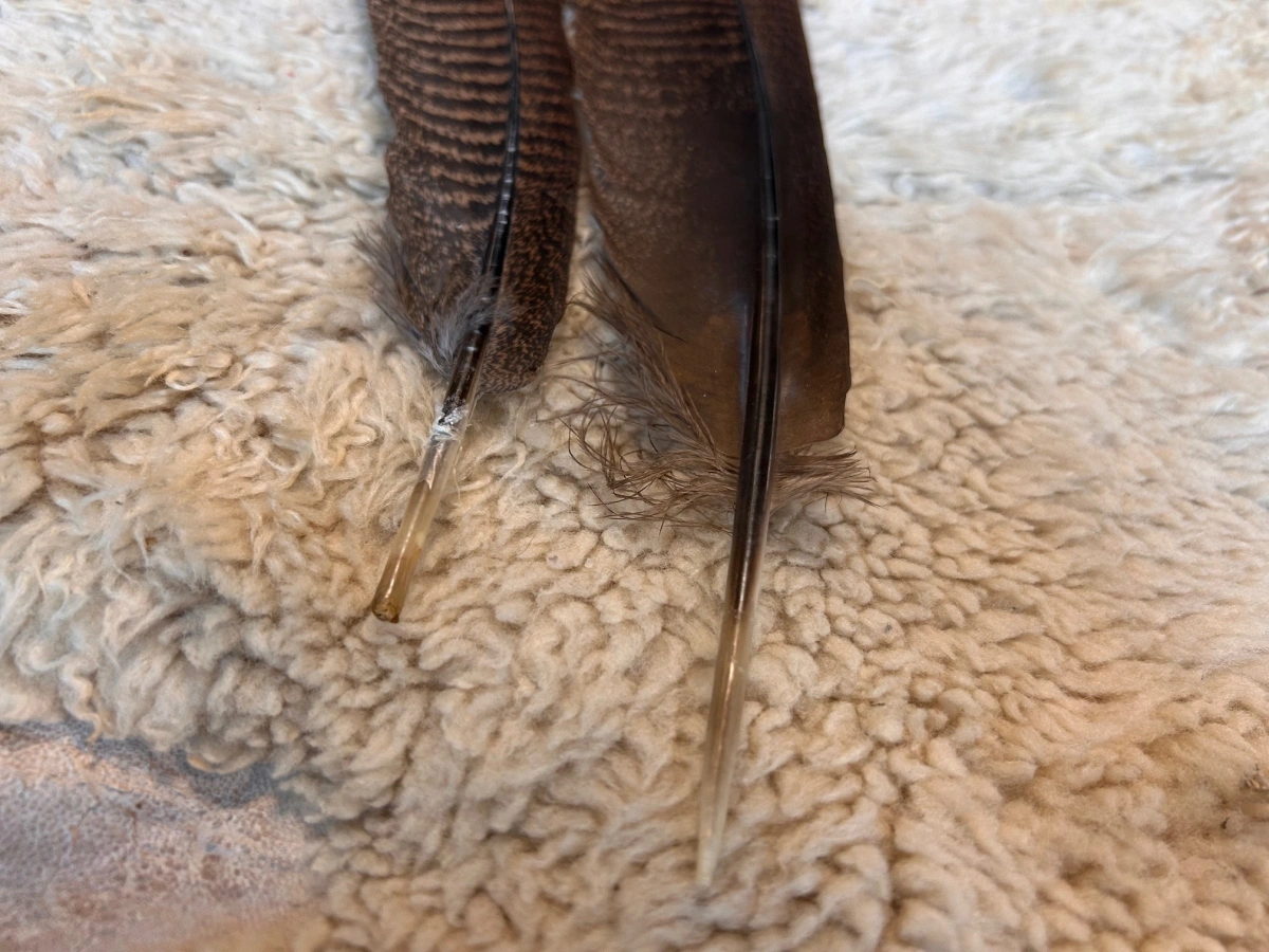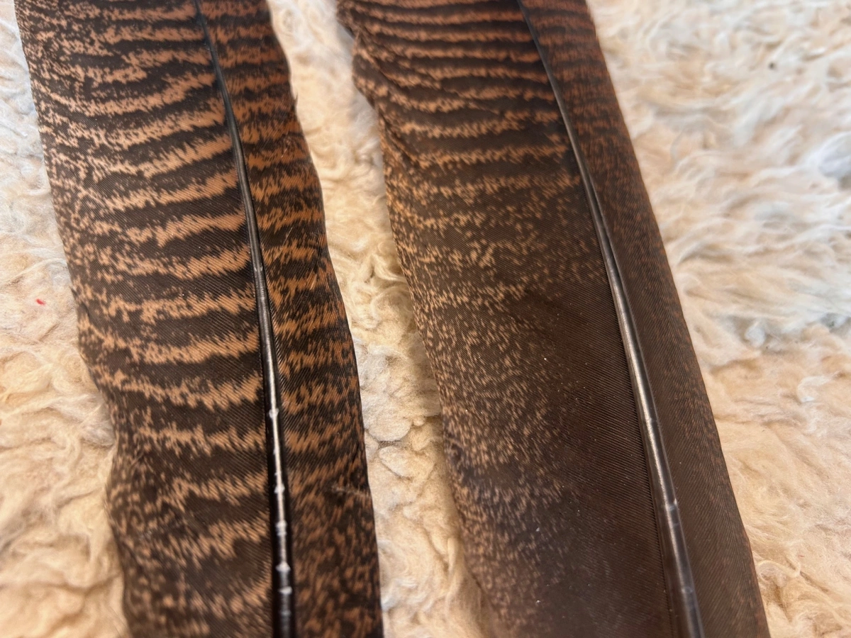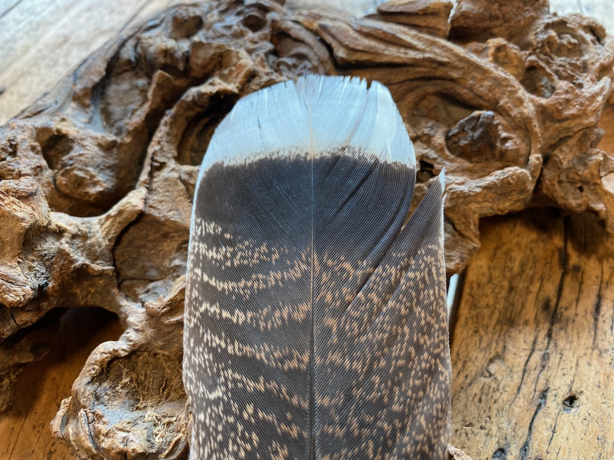 Grosse, naturbelassene Schwanzfeder vom wilden Truthahn, einzigartig in Länge und Zeichnung. Ideal als Räucherfeder, für Rituale oder als dekoratives Naturstück.