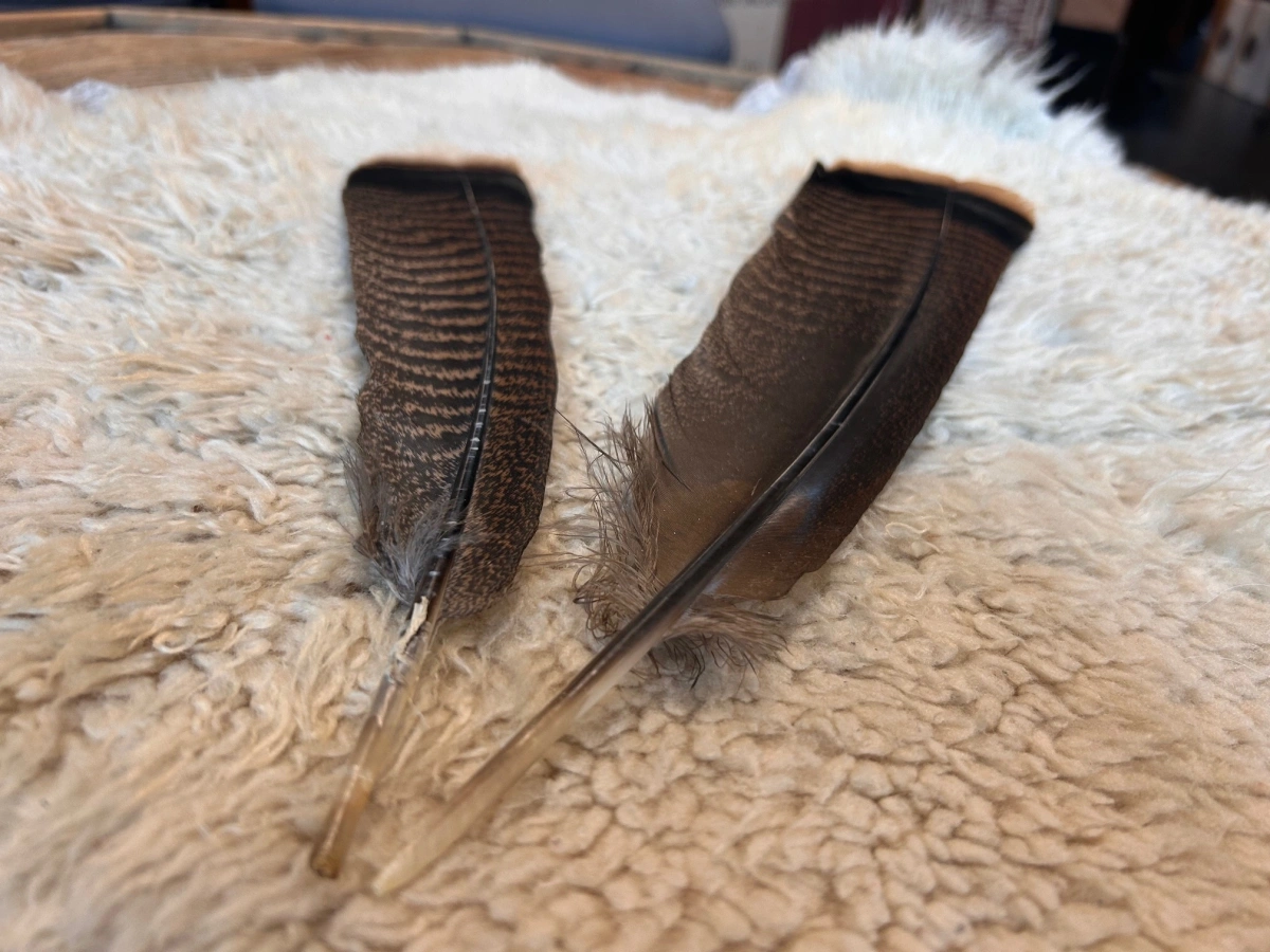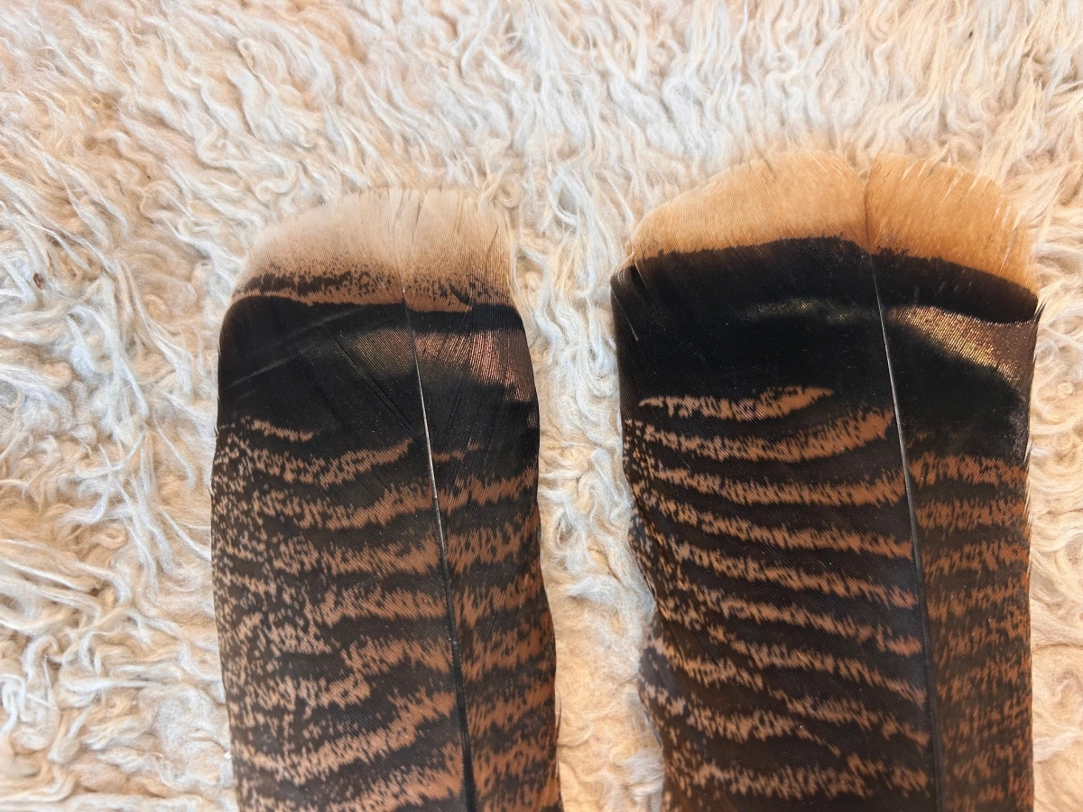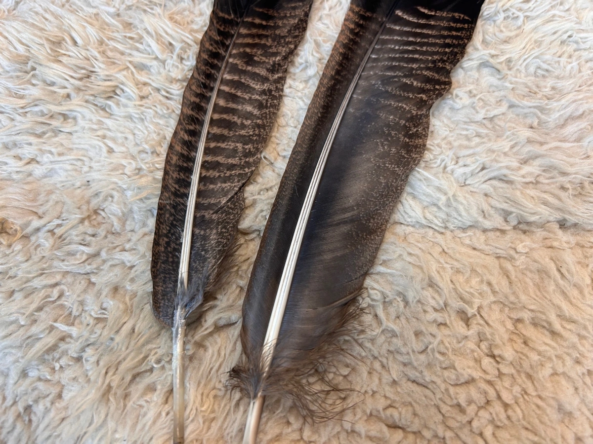 Diese grosse Schwanzfeder stammt vom wilden Truthahn, einem frei lebenden Tier, das den weiten Himmel kennt und nicht aus Massentierhaltung stammt. Jede Feder ist ein einzigartiges Naturstück mit kraftvoller Zeichnung und einer Länge von 30 bis 40 cm. Auf Wunsch suchen wir für Dich passende Federn aus, mit denen Du einen Räucherfächer gestalten kannst. Sie eignet sich für Rituale, energetische Reinigung oder als naturverbundene Dekoration – ein Symbol für Freiheit und Verbundenheit mit der Natur.