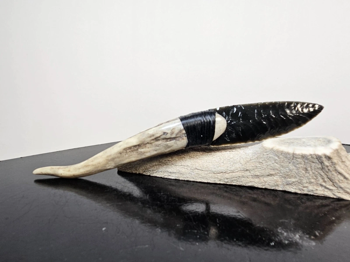 Das Obsidianmesser von Kenny Hull hat eine schwarze Klinge, Hirschhorngriff, Länge ca. 18 cm, signiert 2025 und handgefertigt in Flintknapping-Technik.