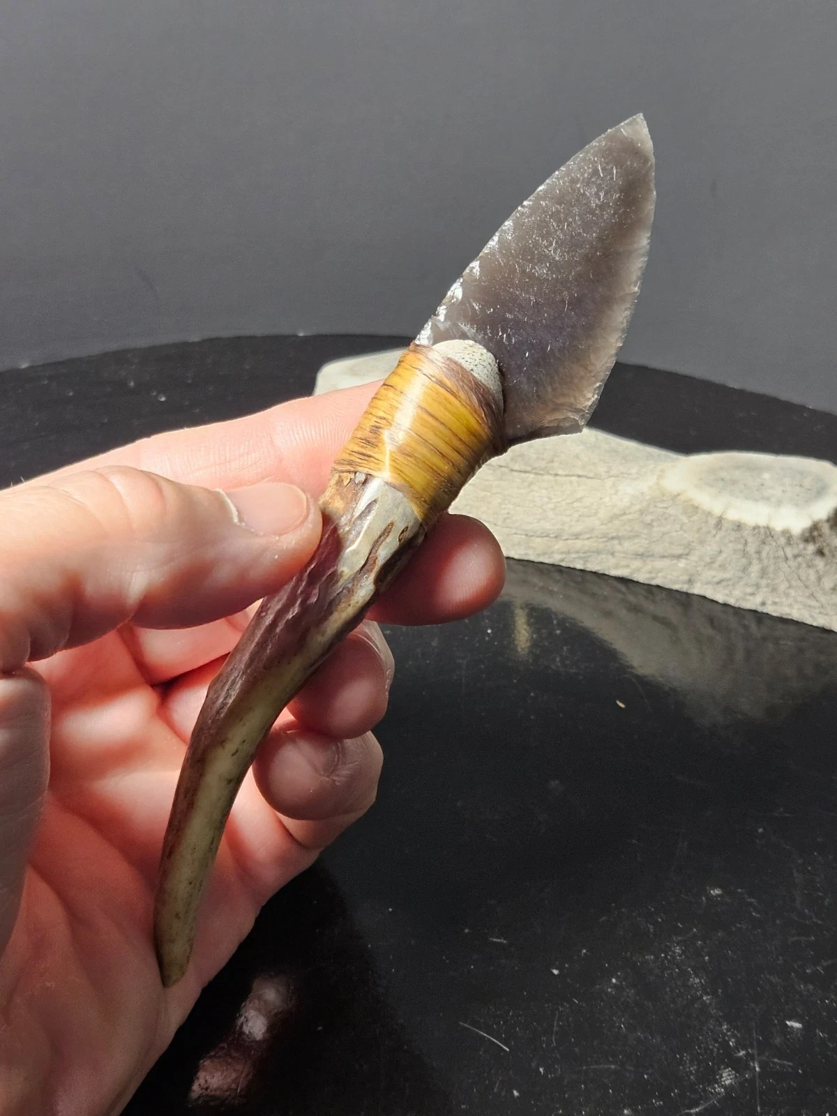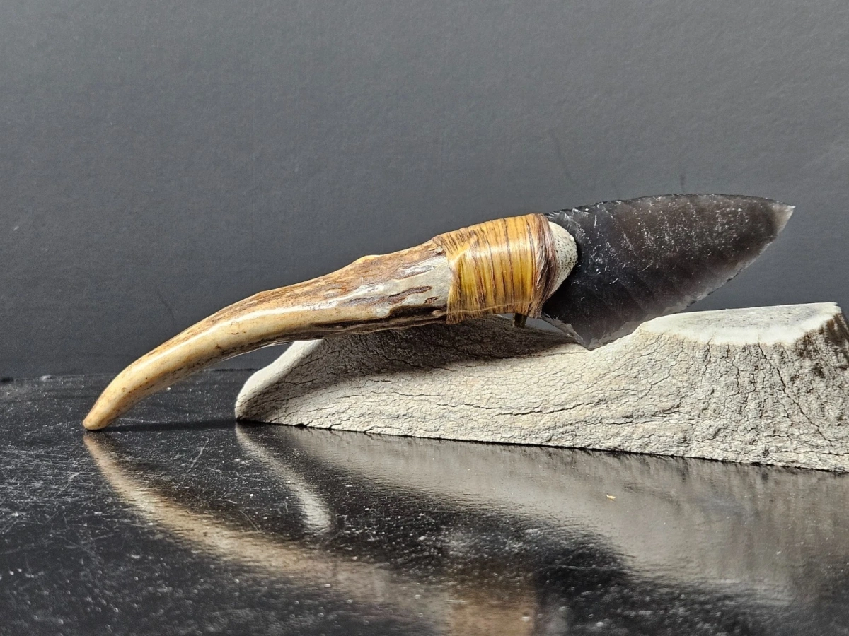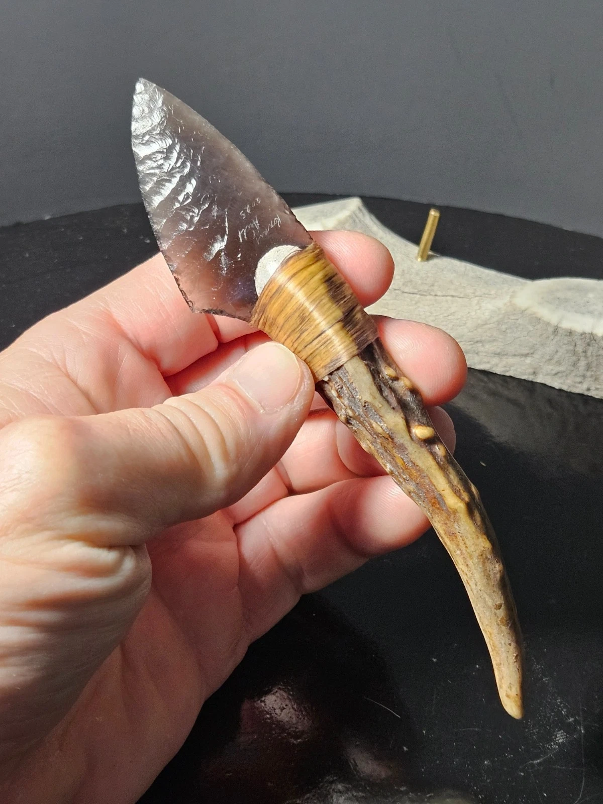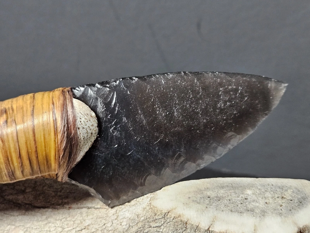 Handgefertigtes Obsidianmesser von Kenny Hull mit Hirschhorngriff und Klinge aus Davis Creek Obsidian, Länge ca. 16 cm. Dieses signierte Unikat (2025) vereint meisterhafte Flintknapping-Technik, ästhetische Gestaltung und historische Bedeutung – ideal für Sammler, rituelle Anwendungen und als besonderes Sammlerstück.