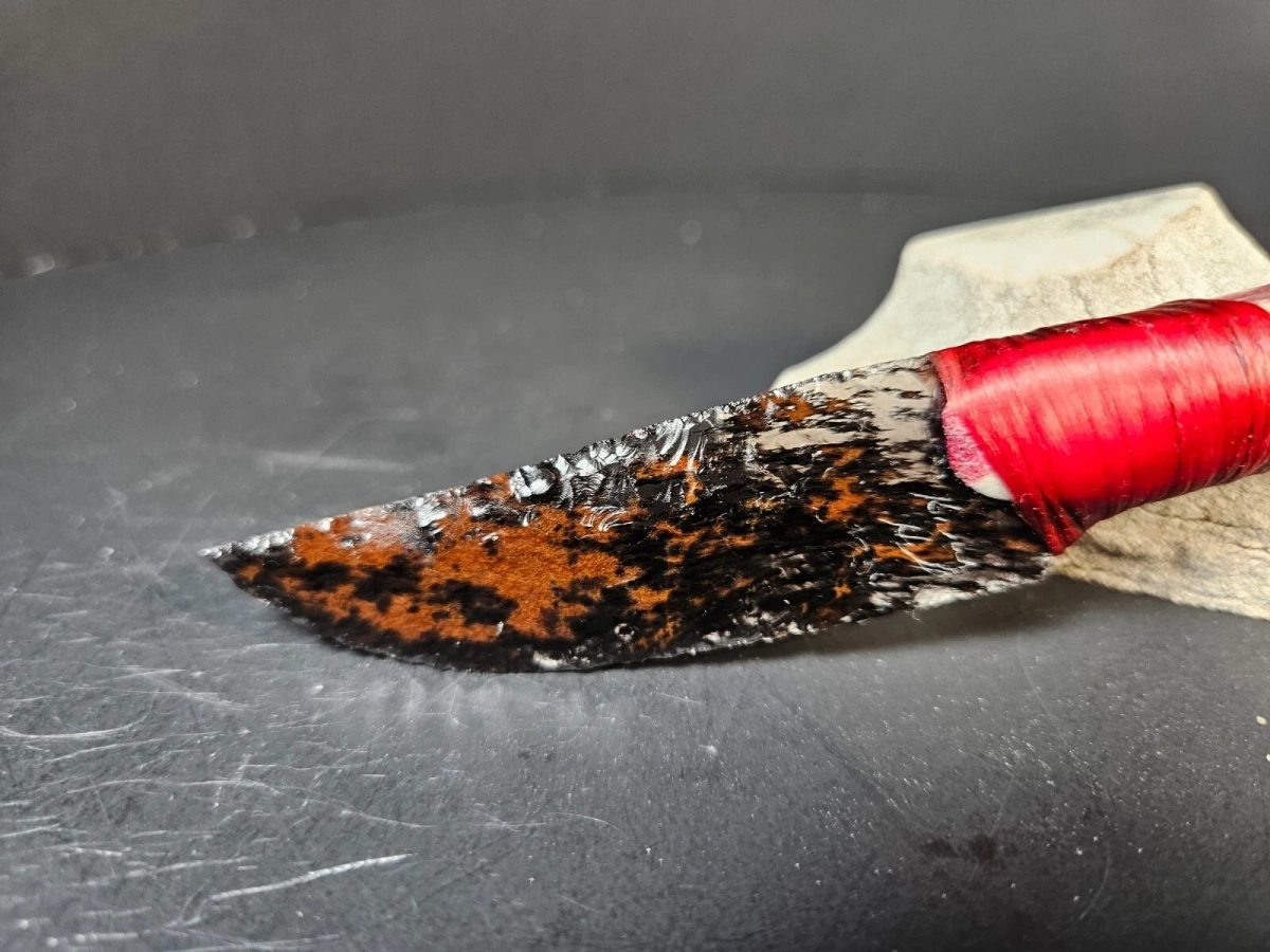 Der Griff aus Hirschhorn verbindet natürliche Materialien mit meisterlicher Gestaltung und liegt angenehm in der Hand. Die Klinge wurde in der traditionellen Flintknapping-Technik gefertigt – eine Kunst, die Geduld, Präzision und jahrelange Erfahrung erfordert. Jede Kerbung entlang der Schneide zeigt die Hingabe, mit der Kenny Hull seit 1995 arbeitet.