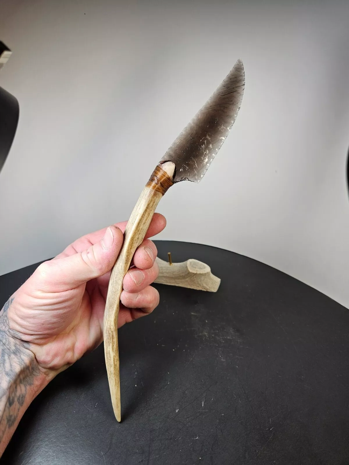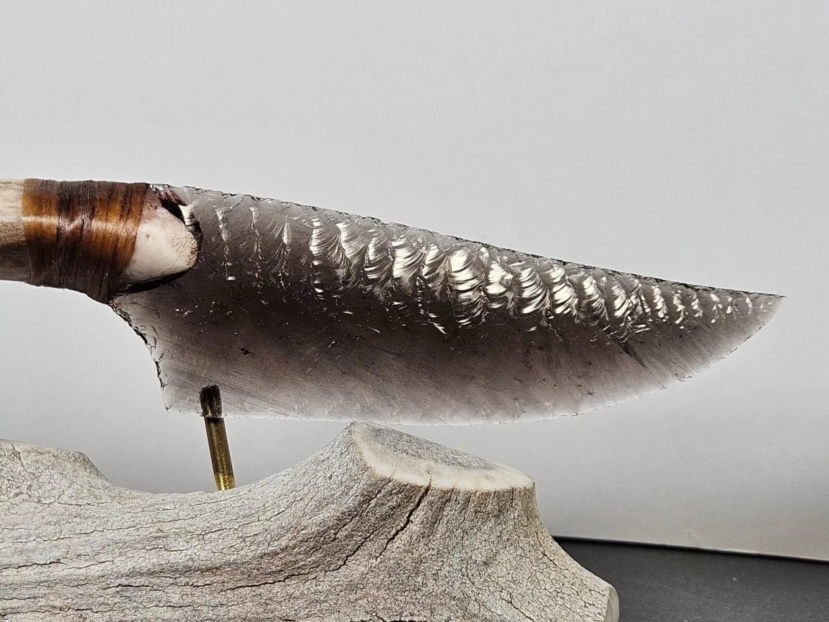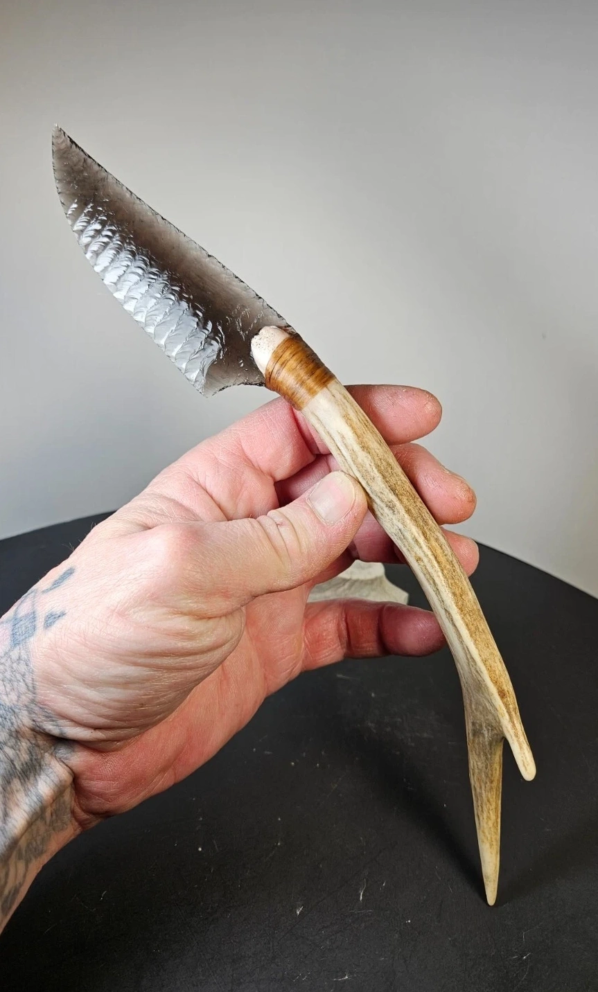 Der Griff aus Hirschhorn verbindet natürliche Materialien mit meisterlicher Gestaltung und liegt angenehm in der Hand. Die Klinge wurde in der traditionellen Flintknapping-Technik gefertigt – eine alte Kunst, die Geduld, Präzision und jahrzehntelange Erfahrung erfordert. Jede Kerbung entlang der Schneide zeigt die Hingabe, mit der Kenny Hull seit 1995 arbeitet.