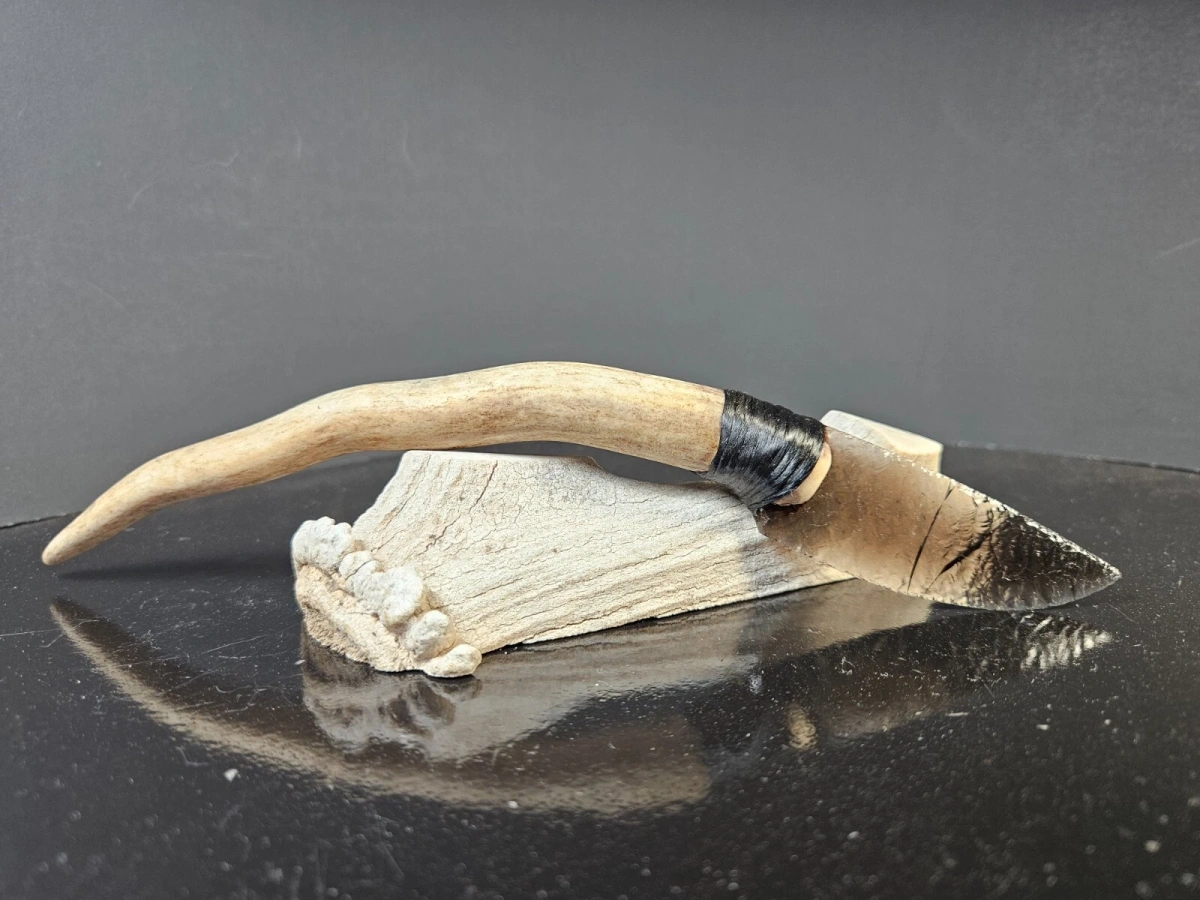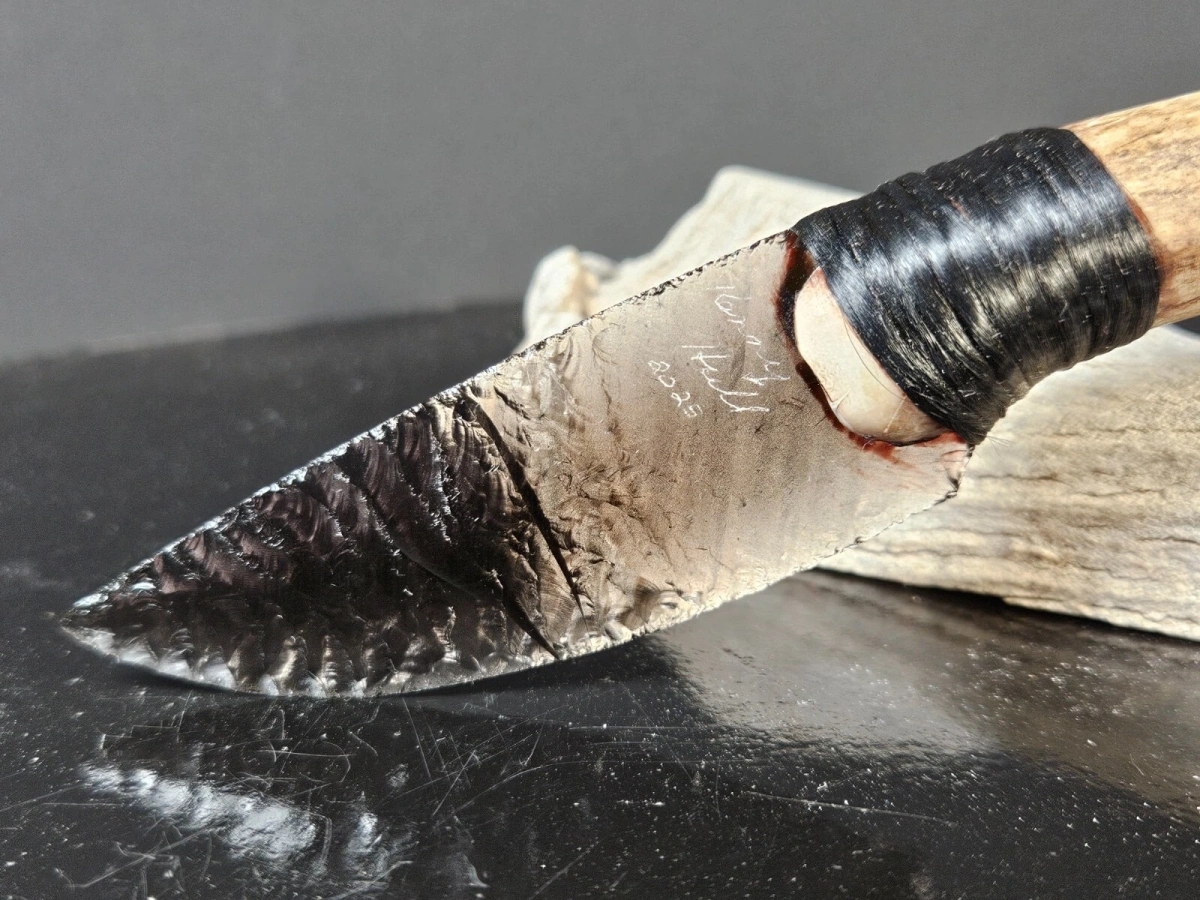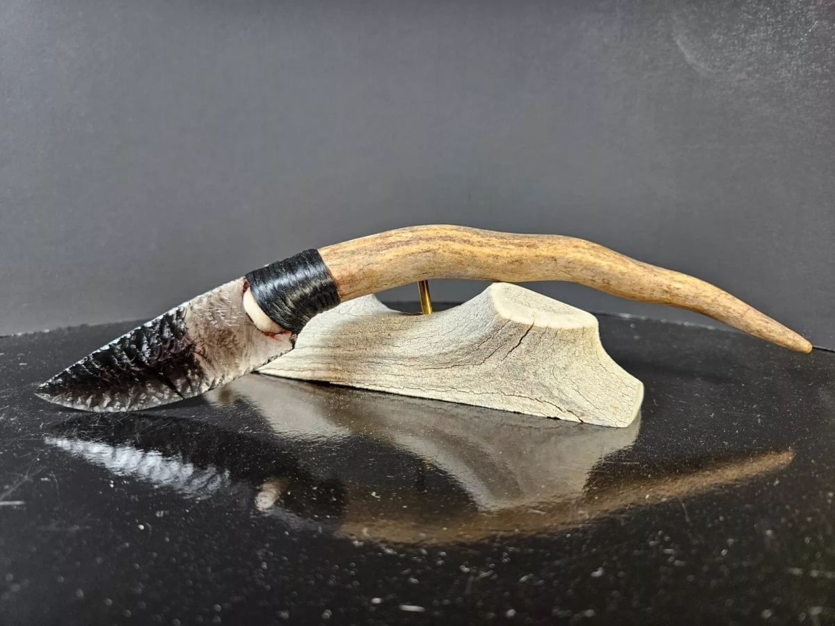 Der Griff aus Hirschhorn verbindet natürliche Materialien mit ästhetischer Gestaltung. Die Klinge wurde in der traditionellen Flintknapping-Technik gefertigt – eine Kunst, die Geduld, Präzision und jahrzehntelange Erfahrung erfordert. Jede Kerbung entlang der Schneide zeigt die Hingabe, mit der Kenny Hull seit 1995 arbeitet.