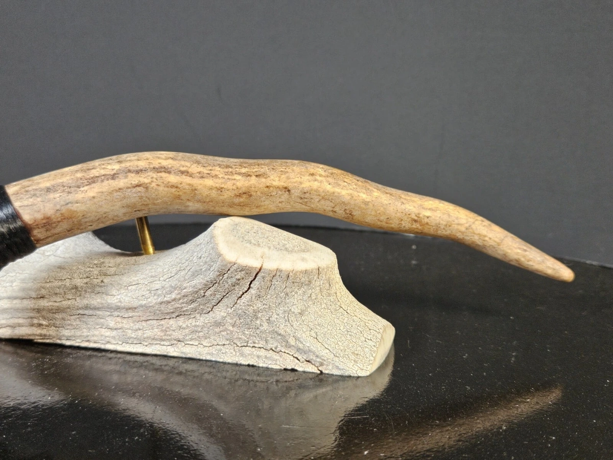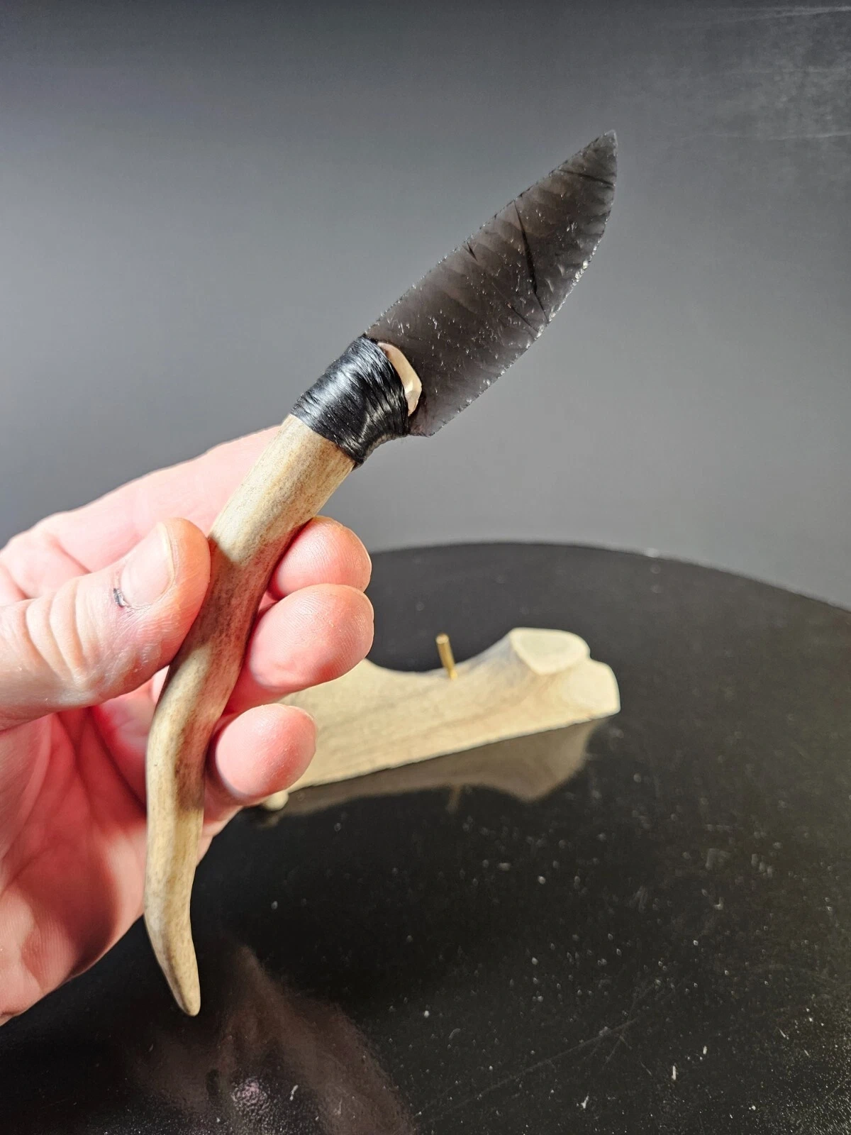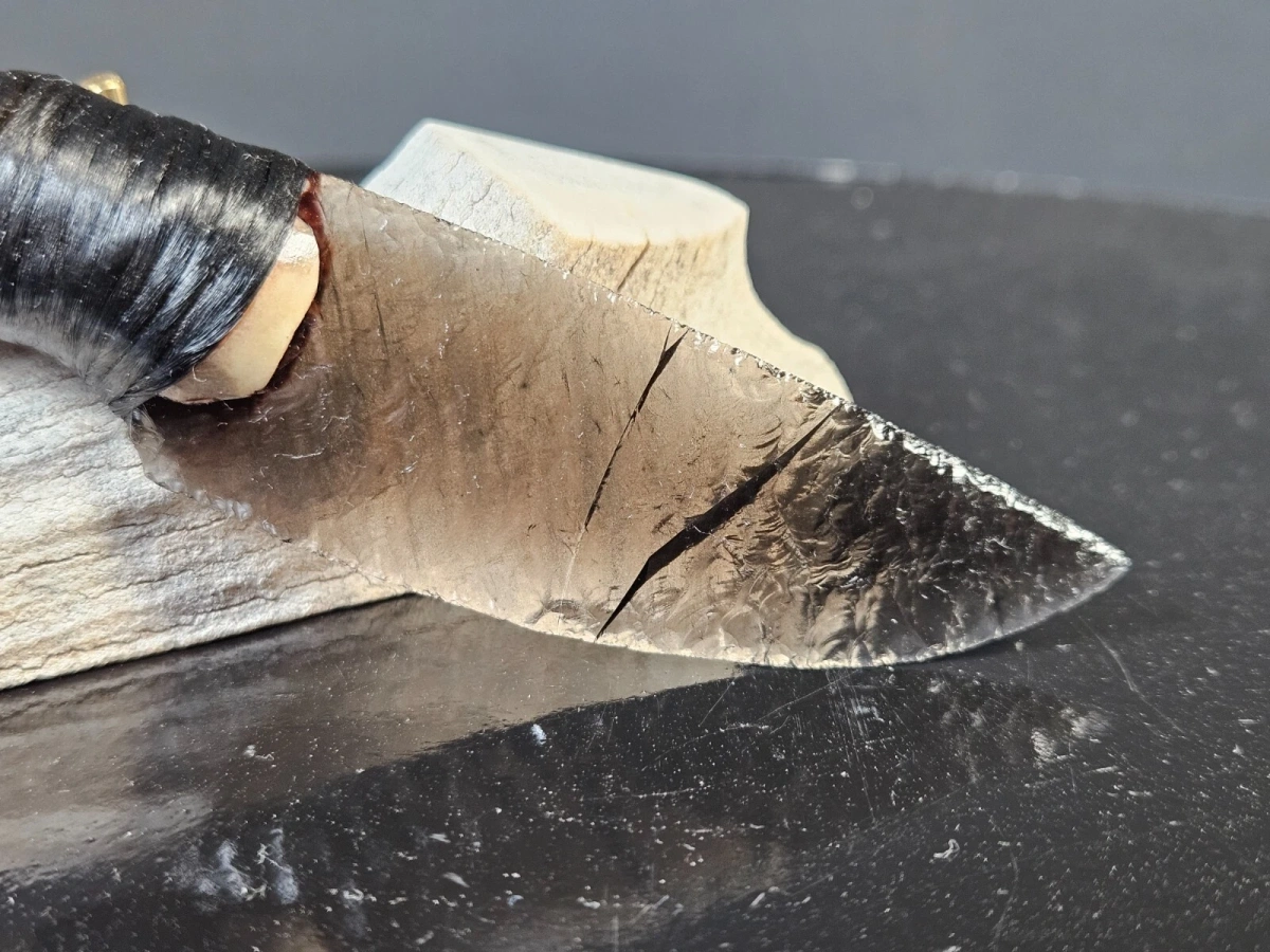 Das Obsidianmesser wurde von Kenny Hull handgefertigt in Flintknapping-Technik. Hirschhorn & Smokey Glass Buttes Obsidian, ca. 22 cm, signiert 2025.