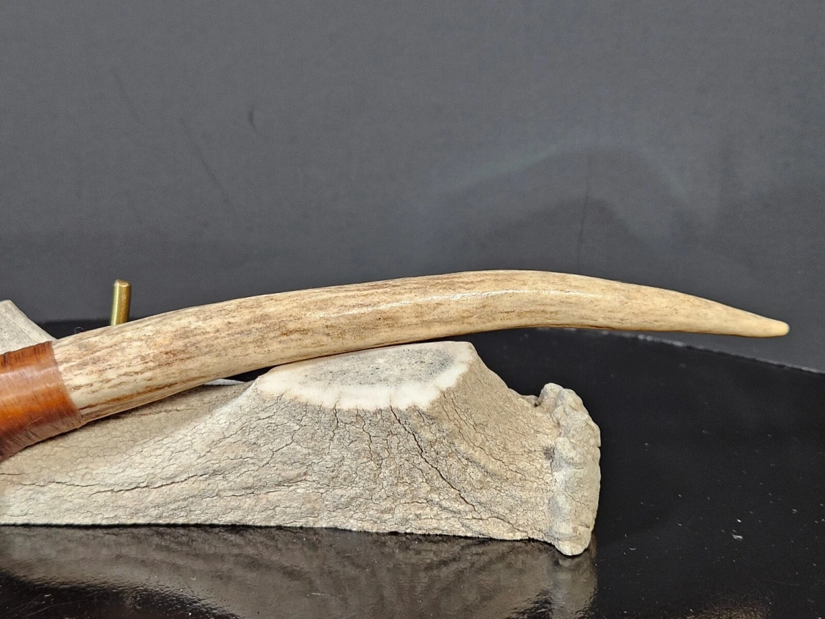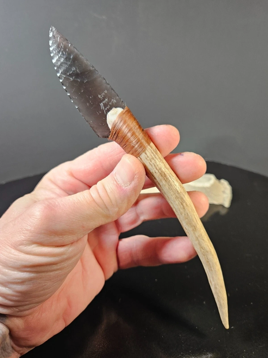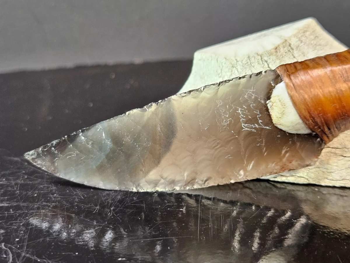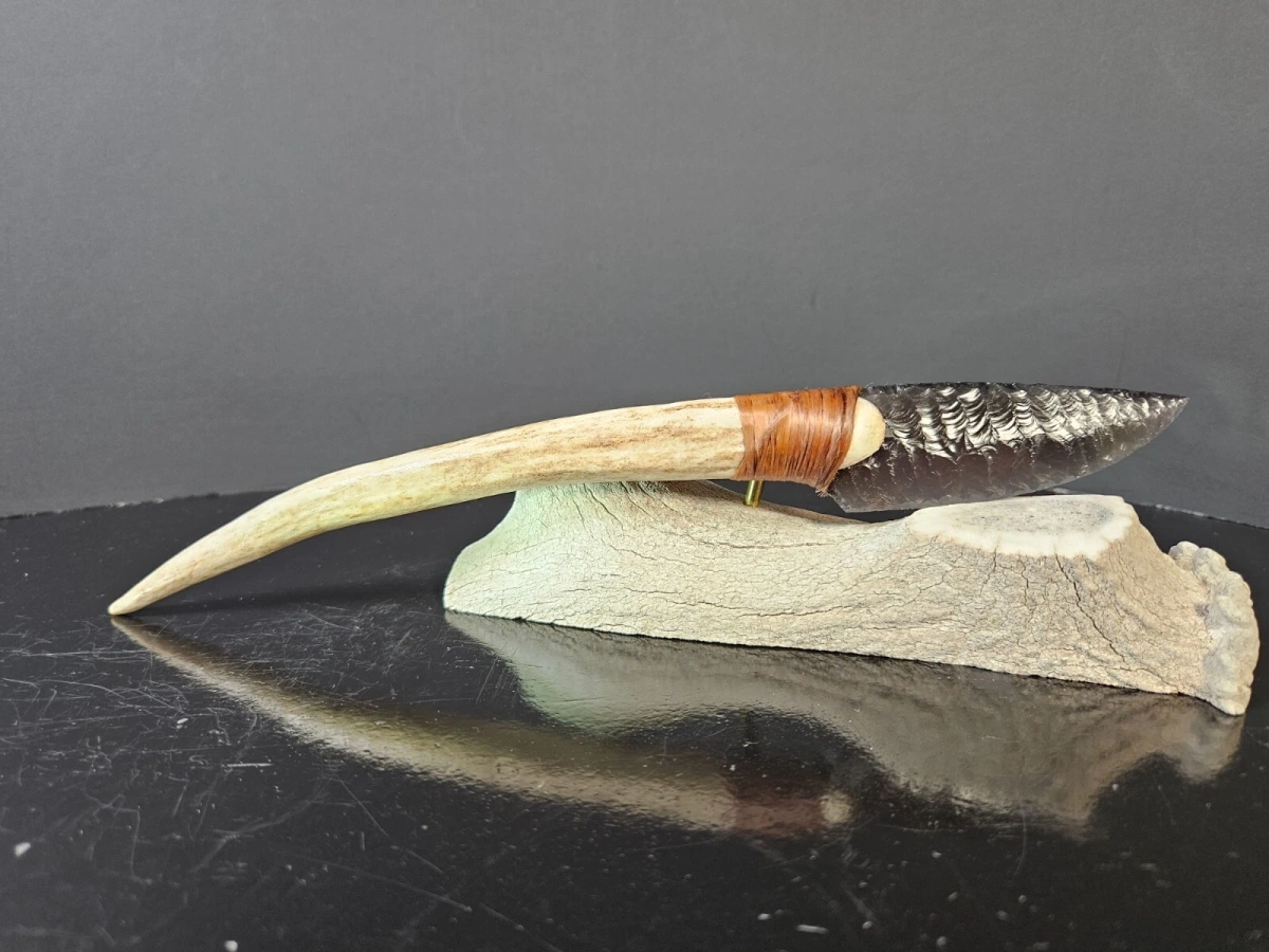 Der Griff aus Hirschhorn verbindet natürliche Materialien mit meisterlicher Gestaltung. Die Klinge wurde in der traditionellen Flintknapping-Technik gefertigt – eine Kunst, die Geduld, Präzision und jahrzehntelange Erfahrung erfordert. Jede Kerbung entlang der Schneide zeigt die Hingabe, mit der Kenny Hull seit 1995 arbeitet.