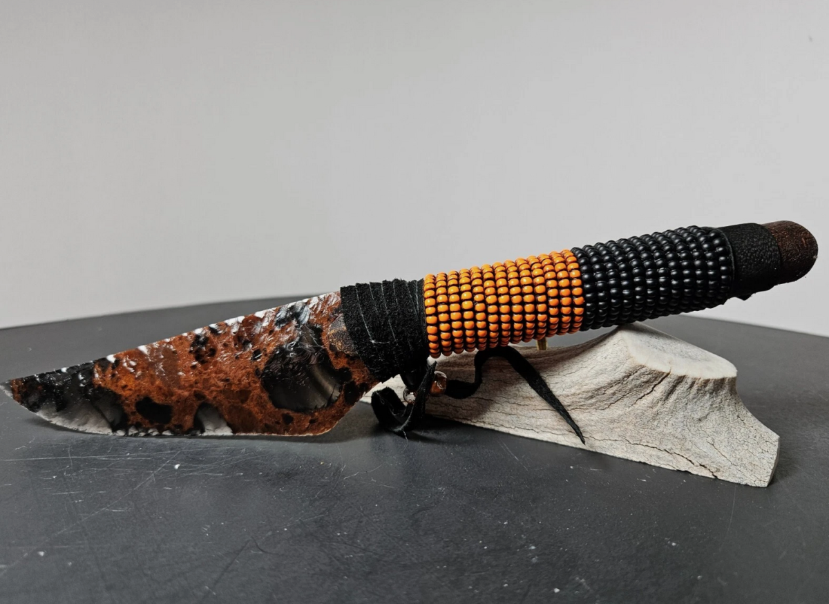Pflegehinweis:Obsidianmesser sind extrem scharf und zugleich zerbrechlich. Sie sollten stets mit Vorsicht und Achtsamkeit gehandhabt werden und niemals zum Schneiden von Lebensmitteln verwendet werden.