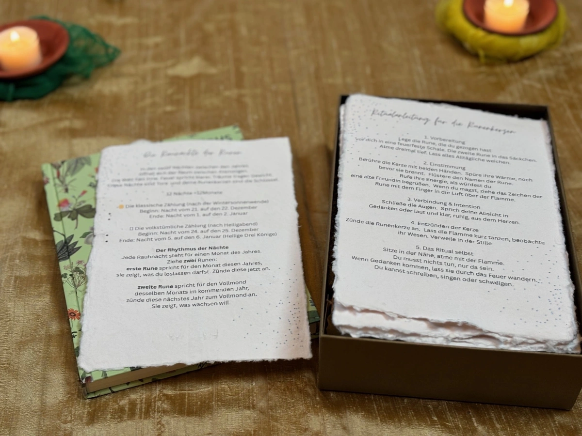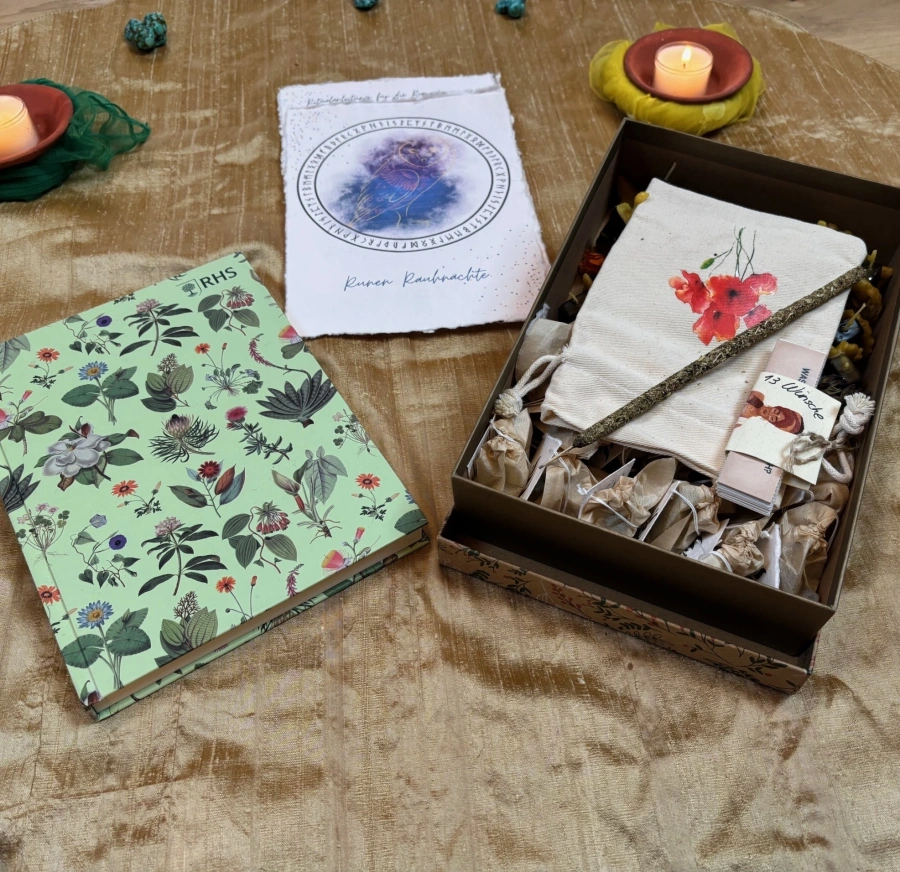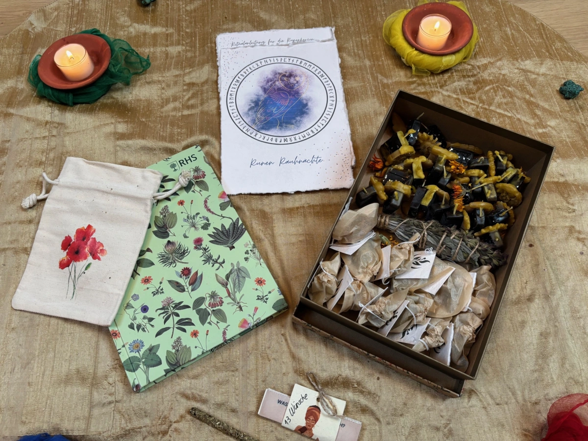 Raunacht- & Runenset von Oksana Leer – handgemacht und einzigartig. Für jede der zwölf Nächte enthält es eine Kerze, einen Tee und einen Wunsch. Die Runen begleiten Dich bei Ritualen, Reflexion und spiritueller Arbeit. Jedes Set ist ein Unikat voller Magie und Intention.