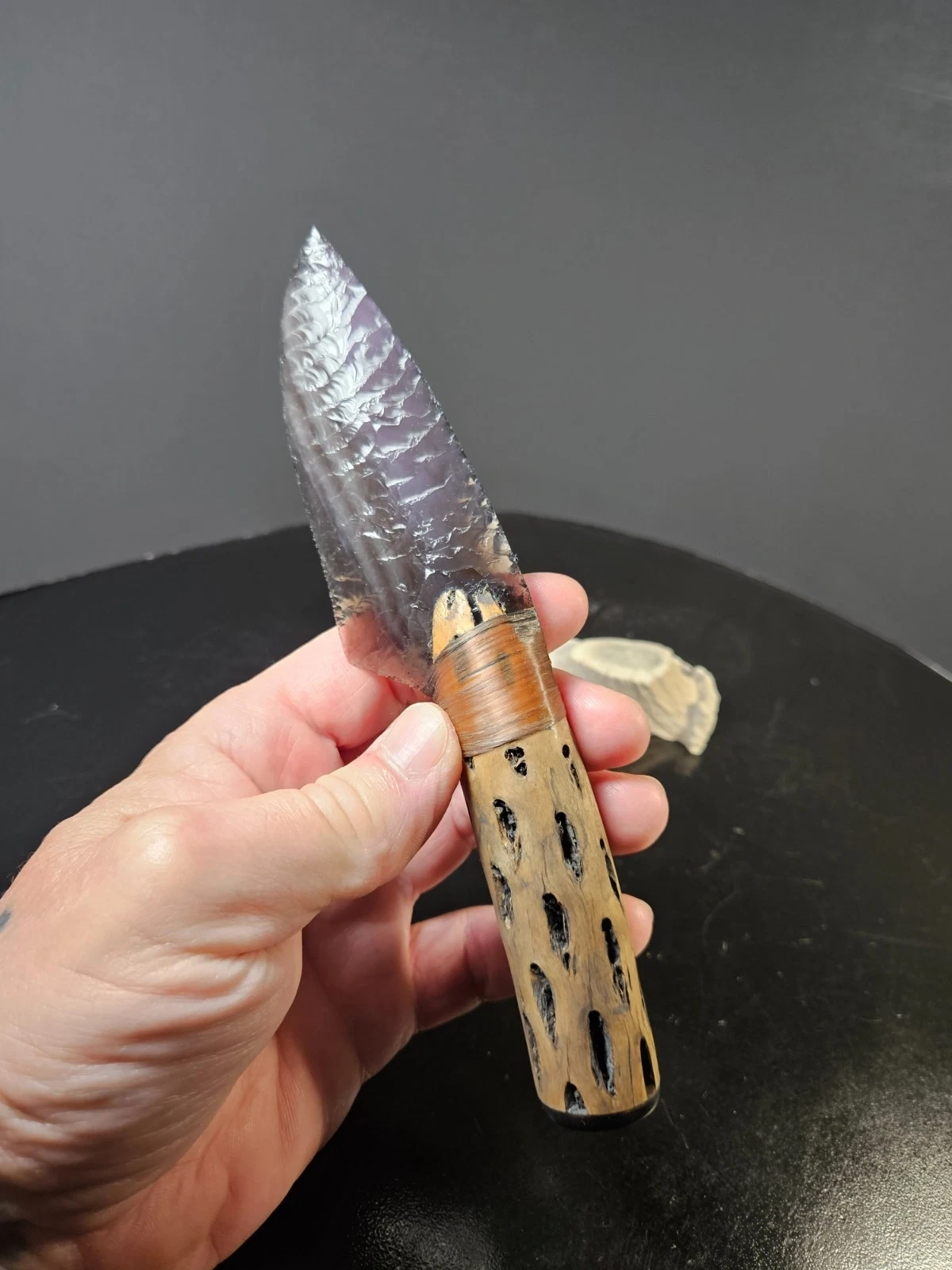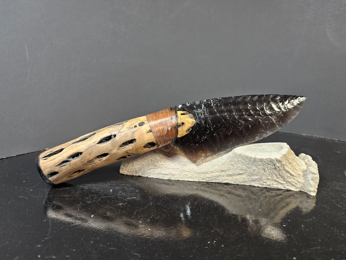 Seit 1995 widmet sich Kenny Hull der Kunst des Flintknapping und fertigt Obsidian Klingen, Messer, Pfeil und Speerspitzen sowie Schmuck und Schnitzarbeiten. Seine Werke werden weltweit gesammelt. Einige seiner Arbeiten wurden als Requisiten für internationale Filmproduktionen geschaffen. Jedes Messer wird sorgfältig in einem neuen Container verpackt und zusätzlich mit einer Präsentationshalterung geliefert.