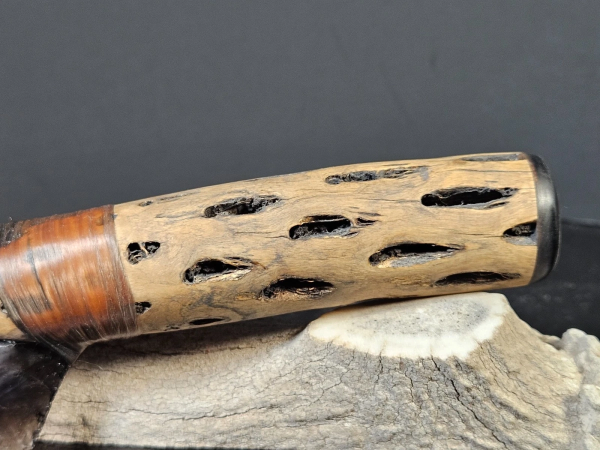 Der Griff aus authentischem Cholla Kaktus unterstreicht den archaischen Charakter des Messers und verbindet es mit der Tradition indigener Kulturen Nordamerikas. Mit einer Länge von ca. 8 1/8 Inches, etwa 20,6 cm, liegt das Messer ausgewogen in der Hand und wirkt zugleich kraftvoll und elegant. Die Klinge ist entlang der gesamten Länge parallel geschlagen und zeichnet sich durch besonders dünne, präzise ausgearbeitete Schneiden aus. Signiert auf der Klinge Kenny Hull 2025.
