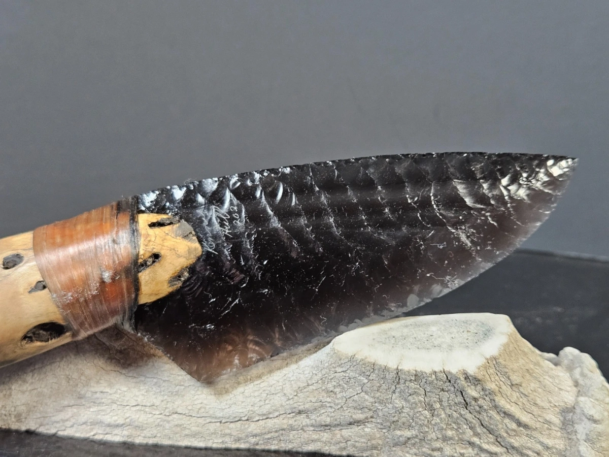 Pflegehinweis: Obsidianmesser sind scharf und zerbrechlich. Immer vorsichtig handhaben, in einer weichen Hülle aufbewahren und niemals zum Schneiden von Lebensmitteln verwenden.