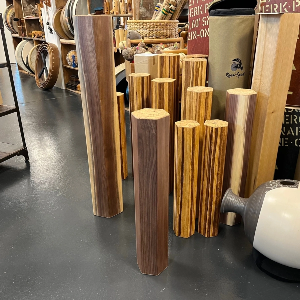 Regenmachersäulen sind in verschiedenen Grössen und mit unterschiedlicher Klangdauer erhältlich. Es handelt sich um ein Originalpatent, hergestellt aus Naturmaterialien, gestimmt auf eine Frequenz von 1 Hz bis 22.000 Hz. Das Instrument wird in Handarbeit hergestellt. Die Oberfläche der Säule ist mit einer Essenz aus duftendem Harz lasiert. Der Klang entsteht durch das Umdrehen der Säule, ähnlich wie bei einer Sanduhr.