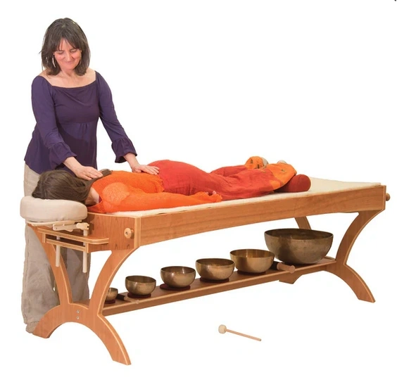 Seit 2015 kontinuierlich weiterentwickelt, entstand die Oktav-Klangmassageliege in enger Zusammenarbeit mit unserer Dozentin Martina Gläser-Böhme, die täglich Klienten auf der Liege behandelt. Das Instrument besticht durch Klang, Form und Funktionalität und ermöglicht eine einzigartige Klangmassage, die Körper, Geist und Seele harmonisiert.