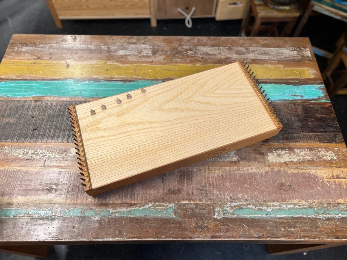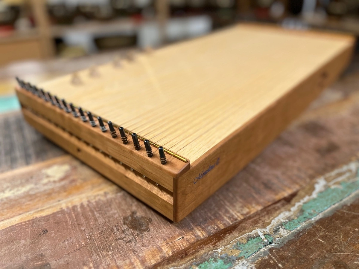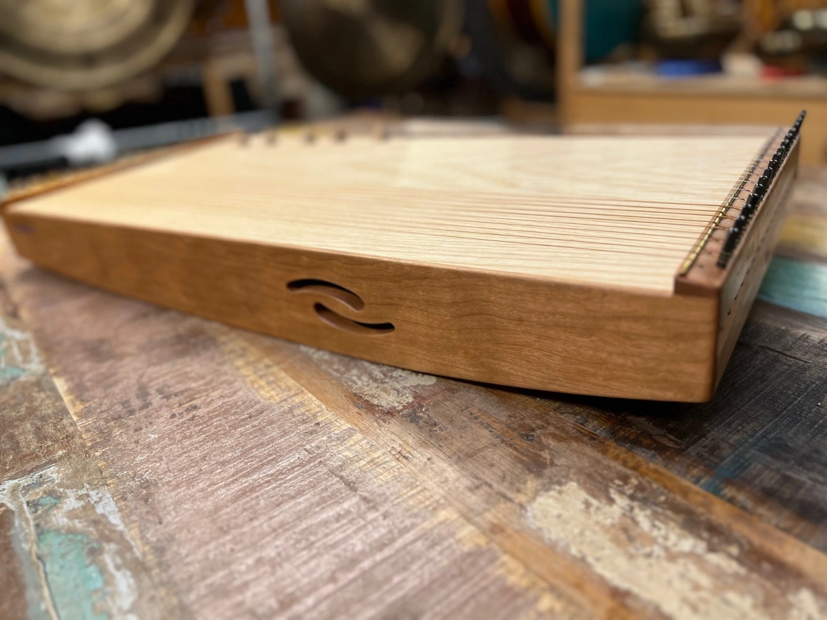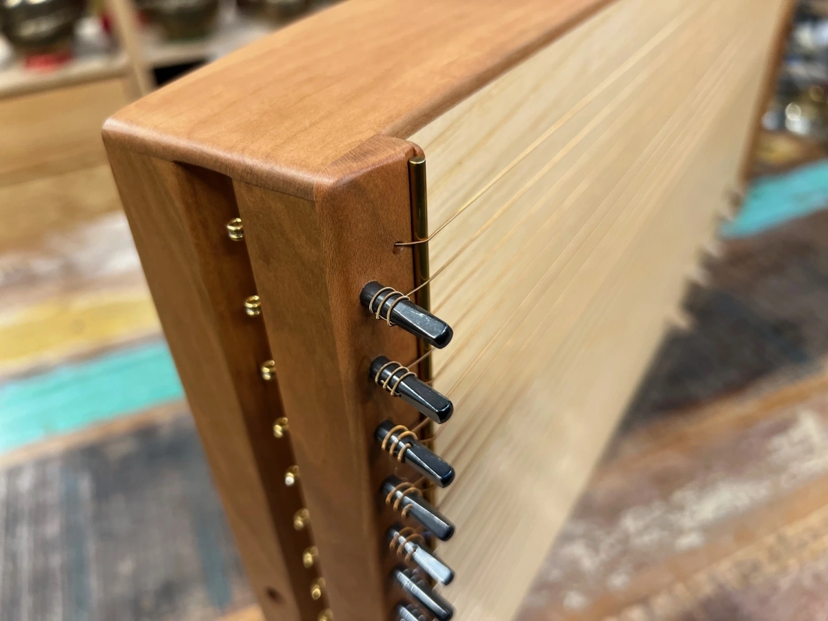 Das 34-saitige Monolina Monochord baut auf dem bewährten Konzept des Monolini auf und ist in den fünf Grundstimmungen D, F, G, A und C erhältlich. Es ist deutlich vielseitiger und eröffnet zusätzliche melodische Möglichkeiten. Unter die obersten Saiten können fünf Reiter mit einer Schablone positioniert werden, wodurch ein melodischer Koto Bereich entsteht. Dieser ergänzt den perlenden, meditativen Klangteppich um sanfte, melodiöse Töne. Das Gehirn greift diese Impulse auf und führt sie innerlich weiter, sodass intuitiv eine pentatonische Dur oder Moll Melodie entsteht, die immer harmonisch klingt.