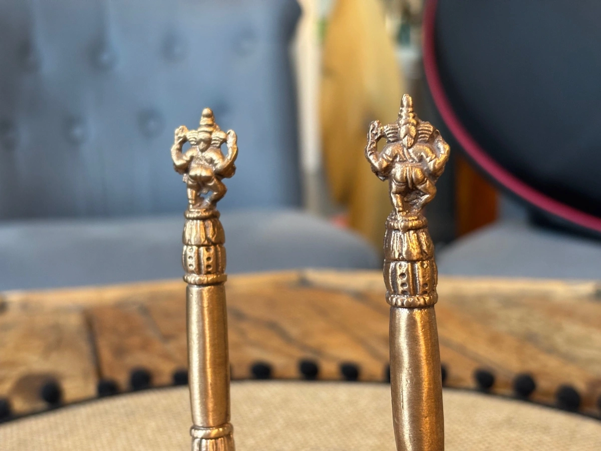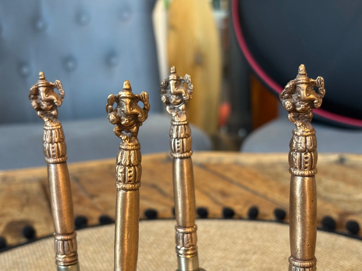 Besonders kraftvoll ist die Ganesha-Handglocke, bei der sich am Stiel die Figur von Ganesha erhebt – dem Beseitiger von Hindernissen und Bringer von Glück. Sein sanftes, weises Lächeln erinnert daran, dass jeder Neubeginn mit einem klaren Geist und offenem Herzen beginnt.