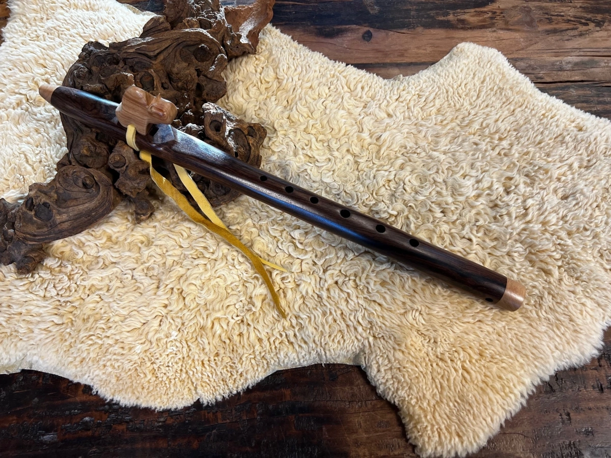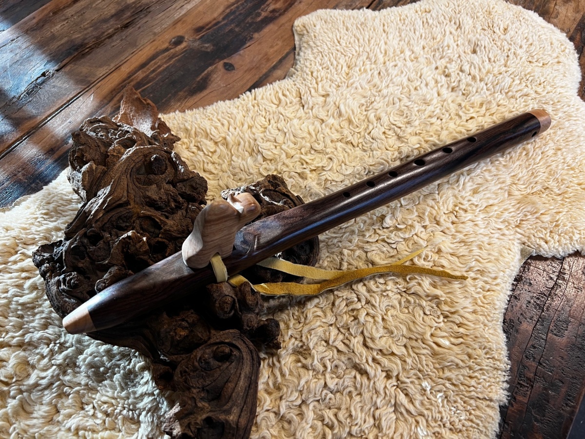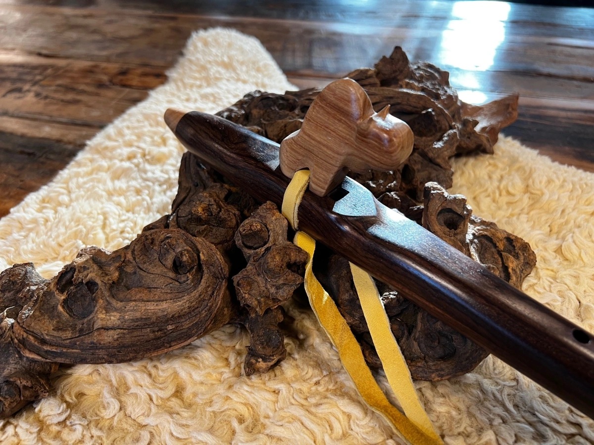 Die Grifflöcher sind so angeordnet, dass auch kleinere Hände die Flöte mühelos spielen können. Traditionell mit einem Brennstab getunt, lädt sie das Element Feuer ein und entfaltet die Energie der Inspiration, die jedem Ton innewohnt.