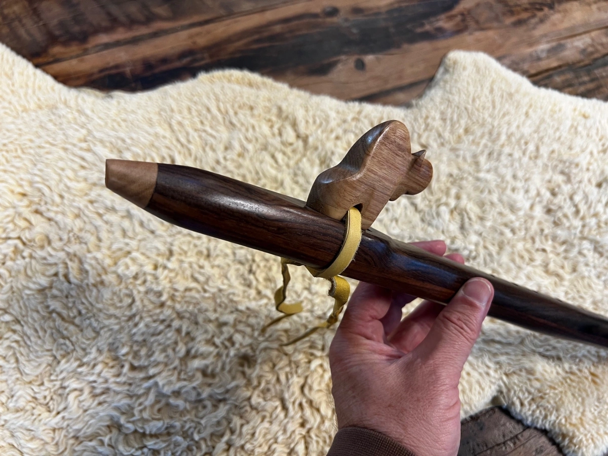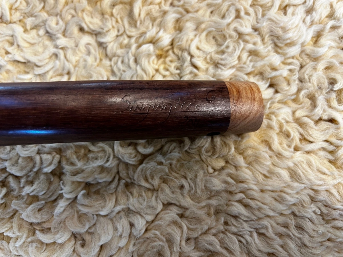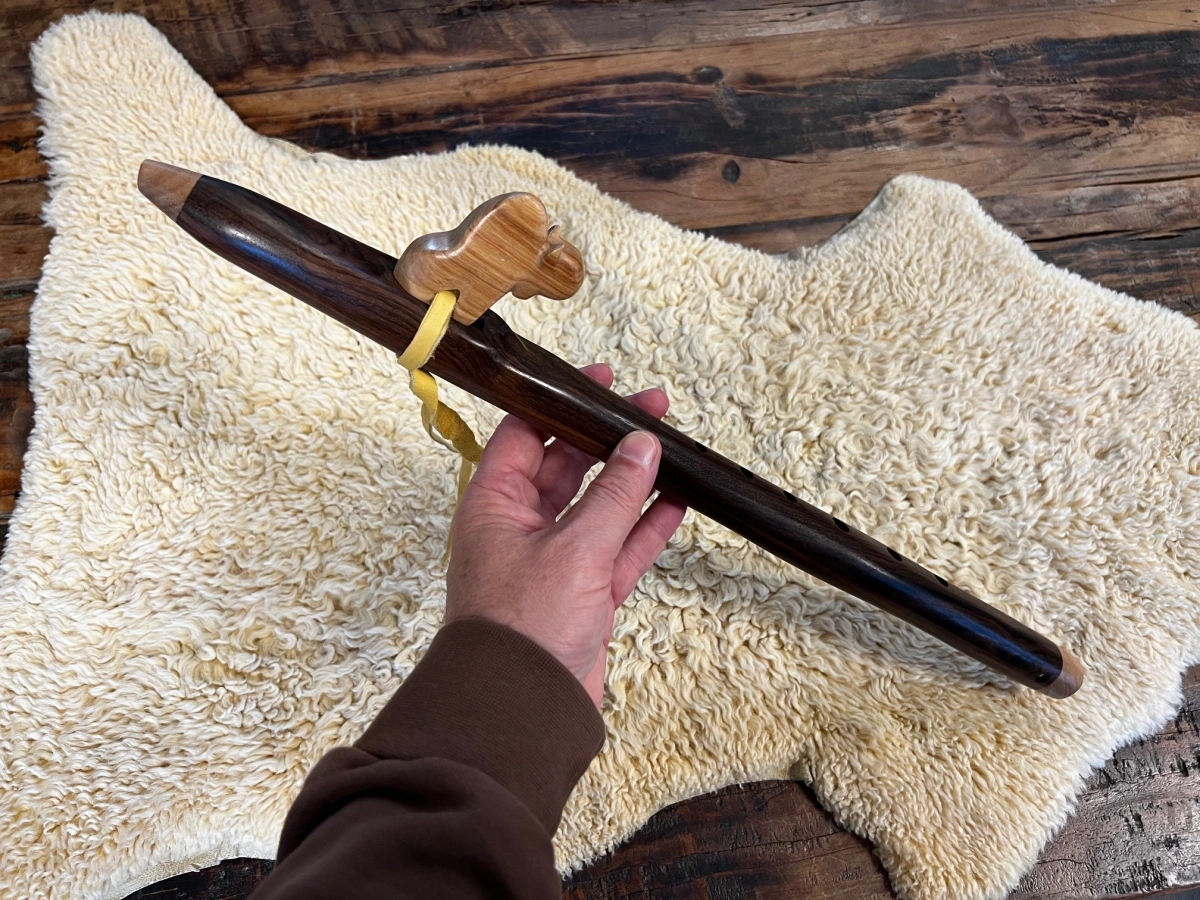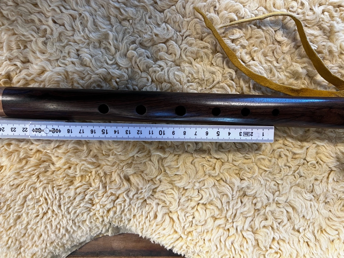 Die Grifflöcher sind so angeordnet, dass auch kleinere Hände die Flöte mühelos spielen können. Traditionell mit einem Brennstab getunt, lädt sie das Element Feuer ein und entfaltet die Energie der Inspiration, die jedem Ton innewohnt.