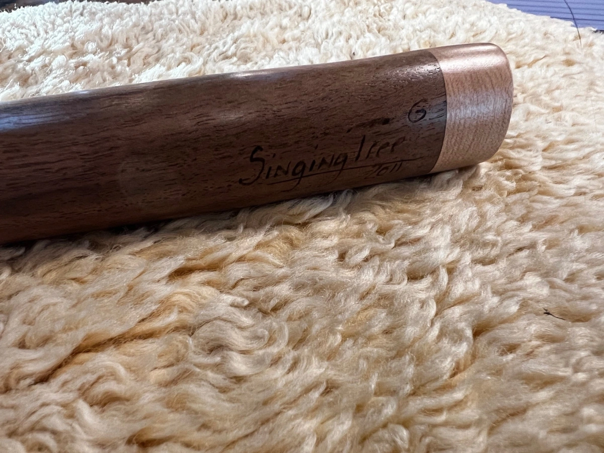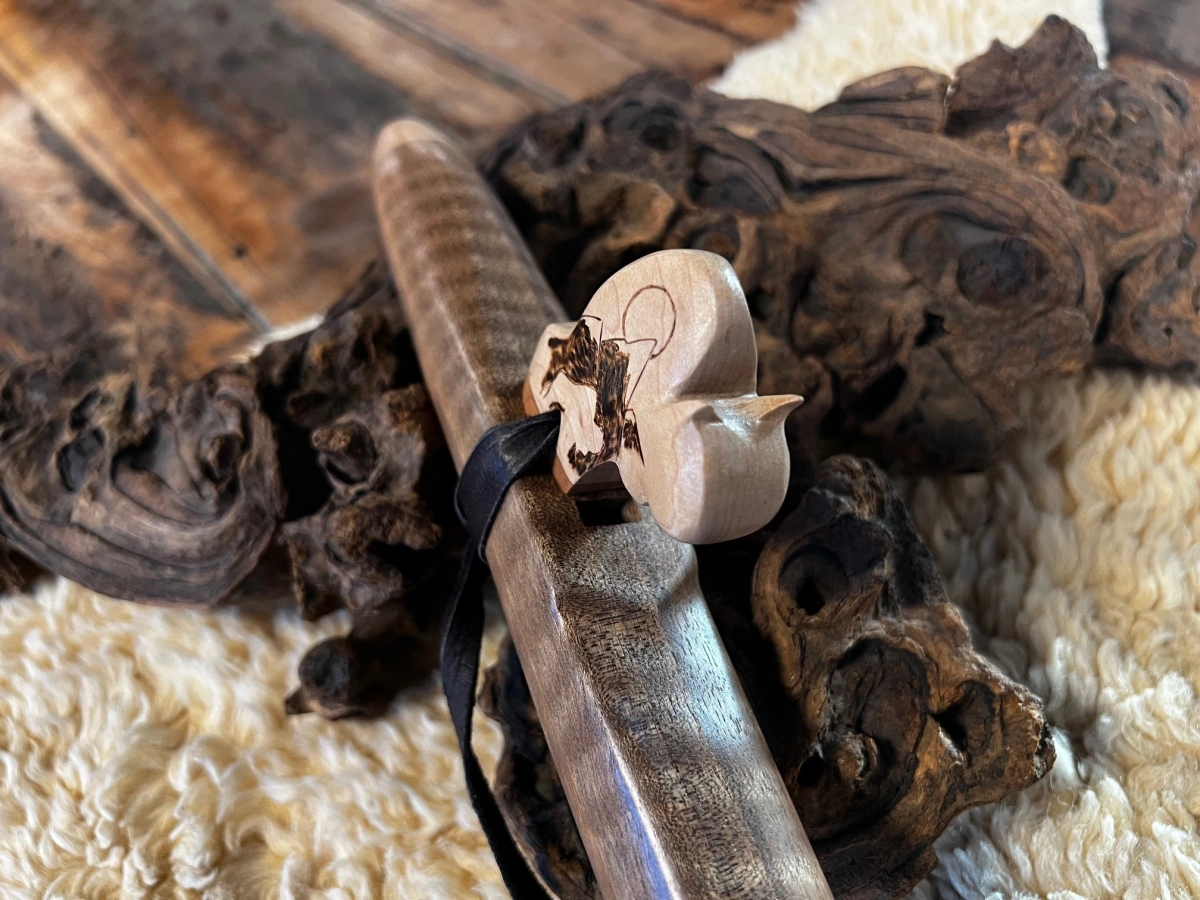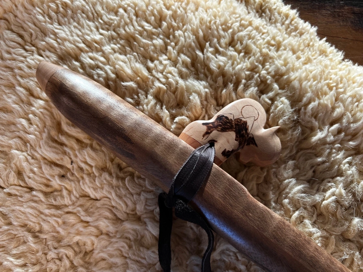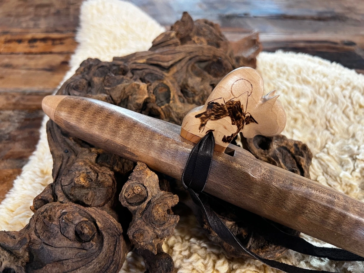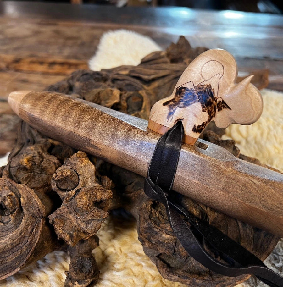Der Flötenkörper aus edlem curly Walnuss Holz harmoniert perfekt mit den kunstvoll gearbeiteten Caps und dem Büffel-Windblock aus Ahornholz. Mit einer Gesamtlänge von 50 cm und einer Innenbohrung von 20 mm liegt sie wunderbar in der Hand. Die Grifflöcher sind so angeordnet, dass auch kleinere Hände die Flöte mühelos spielen können. Traditionell mit einem Brennstab getunt, lädt sie das Element Feuer ein und entfaltet die Energie der Inspiration, die jedem Ton innewohnt.