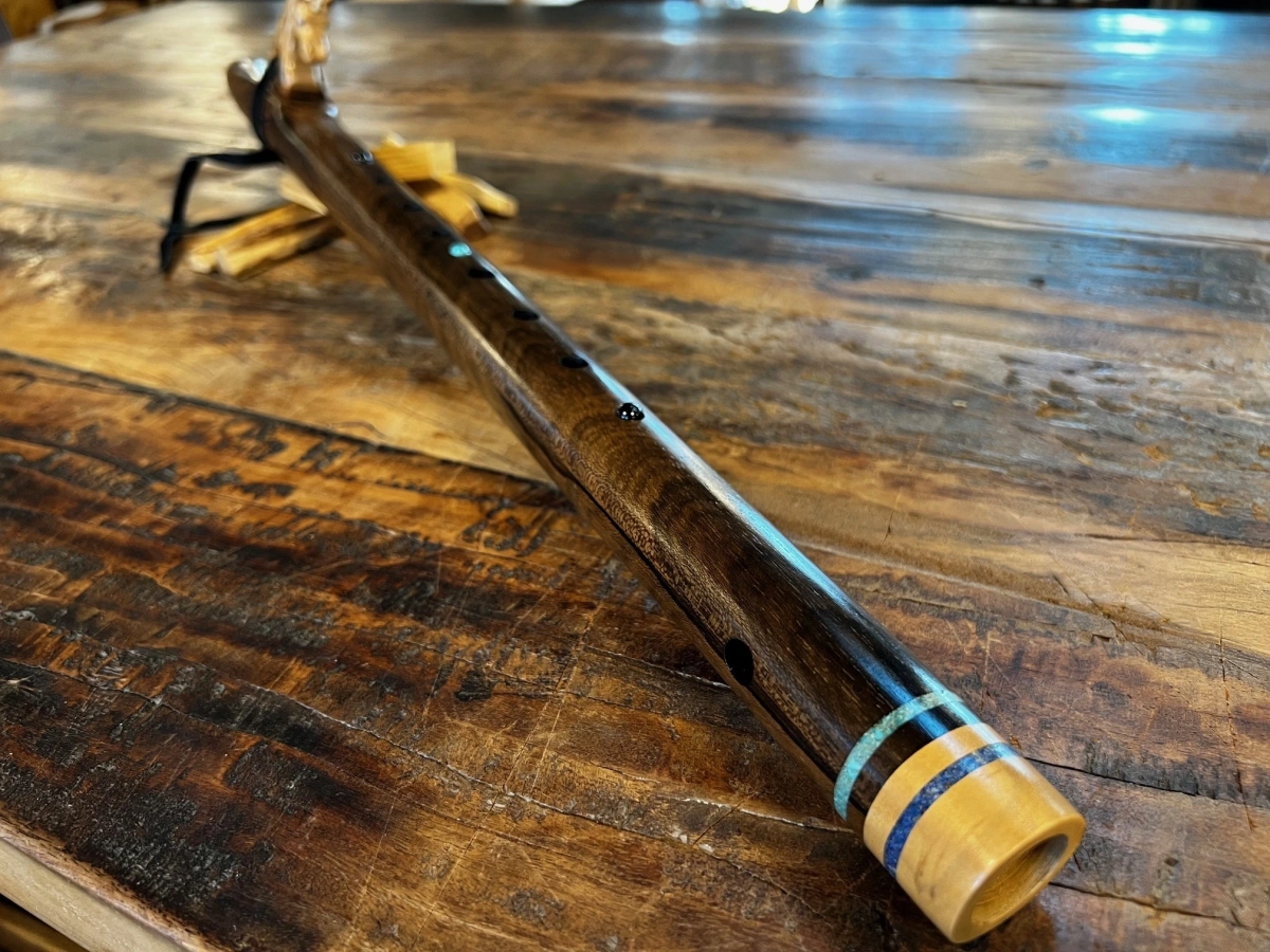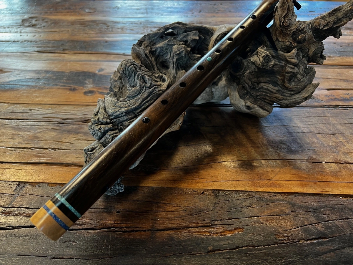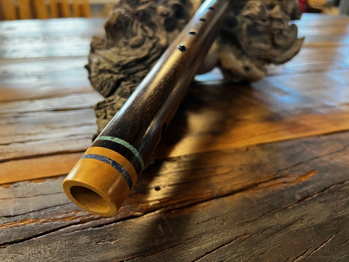 Der gesamte Korpus ist reich verziert mit feinen Einlegearbeiten aus Türkis, Lapislazuli und Obsidian. Rund um die Ringe und zwischen den Grifflöchern leuchten diese Steine wie kleine funkelnde Sternpunkte, die der Flöte eine mystische, fast zeremonielle Aura verleihen. Jede der Einlagen trägt ihre eigene Bedeutung – Türkis als Schutz- und Heilstein, Lapislazuli als Stein der Wahrheit und inneren Weisheit, Obsidian als Hüter von Klarheit und Transformation.
