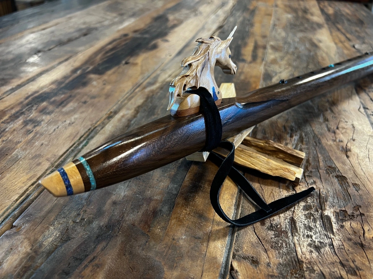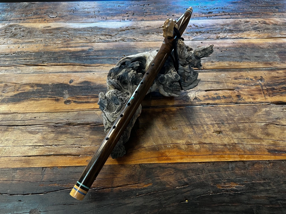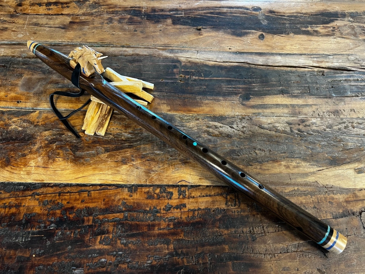 Der gesamte Korpus ist reich verziert mit feinen Einlegearbeiten aus Türkis, Lapislazuli und Obsidian. Rund um die Ringe und zwischen den Grifflöchern leuchten diese Steine wie kleine funkelnde Sternpunkte, die der Flöte eine mystische, fast zeremonielle Aura verleihen. Jede der Einlagen trägt ihre eigene Bedeutung – Türkis als Schutz- und Heilstein, Lapislazuli als Stein der Wahrheit und inneren Weisheit, Obsidian als Hüter von Klarheit und Transformation.