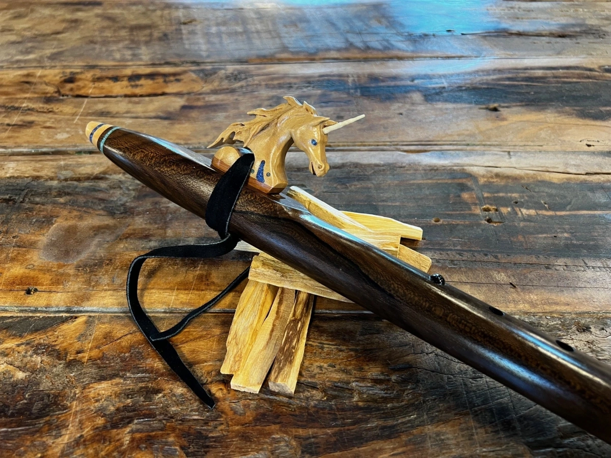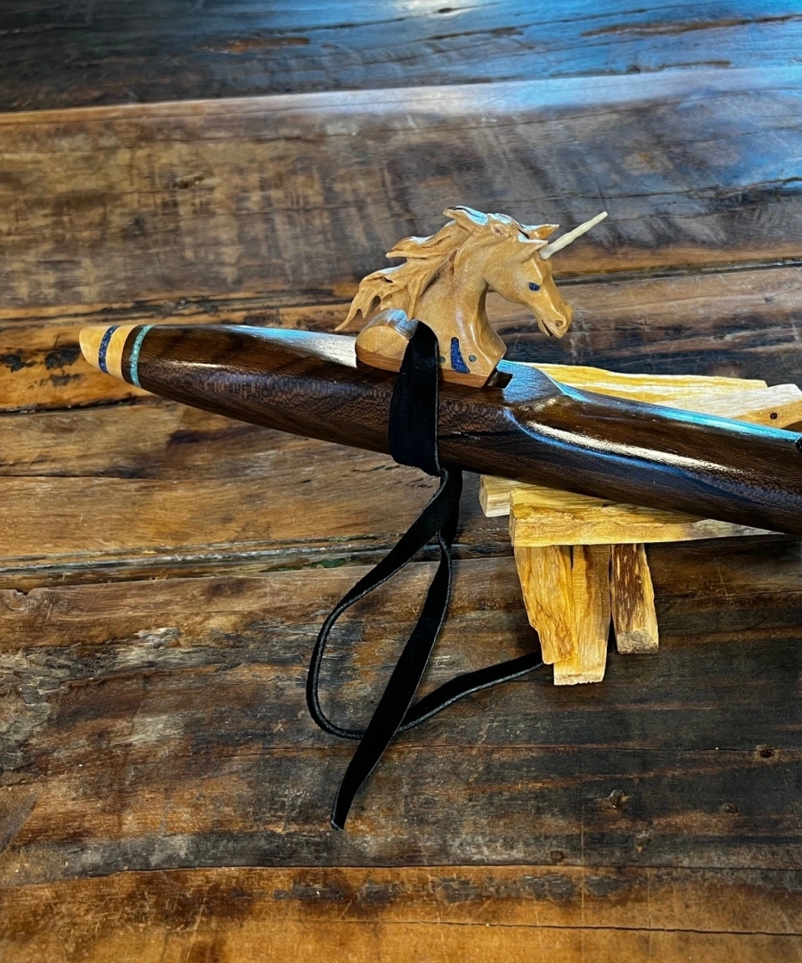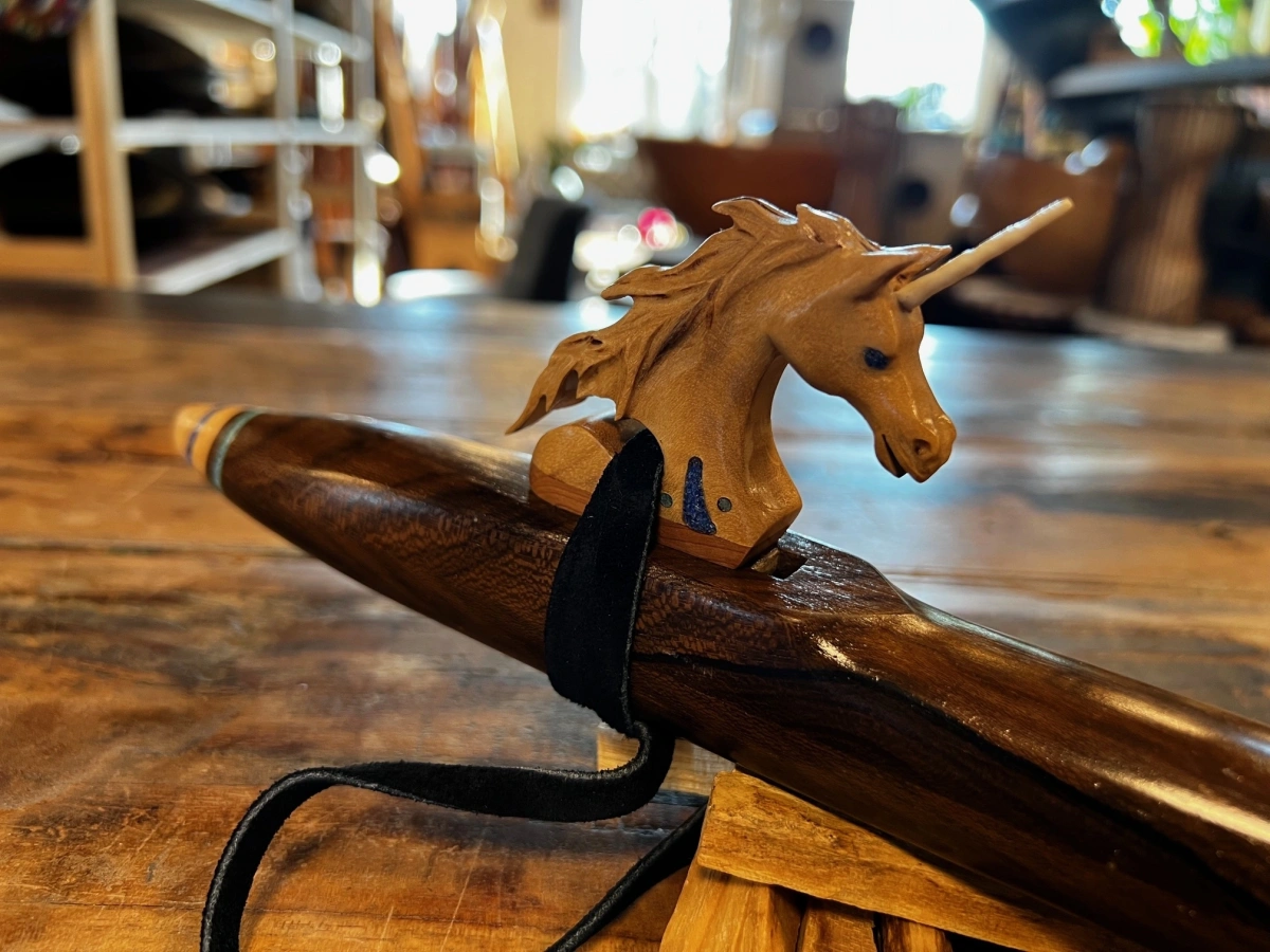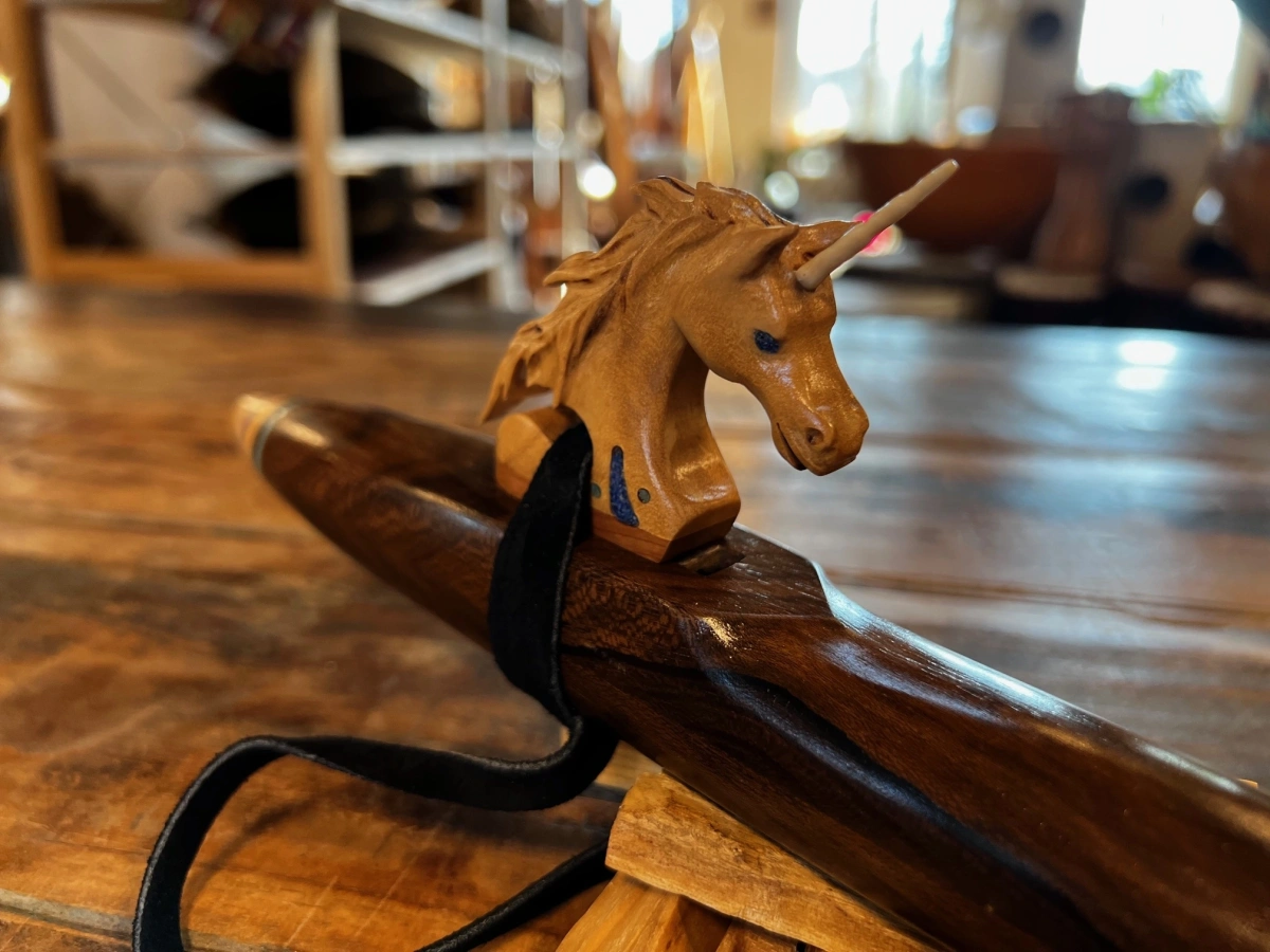 Das Herzstück dieses Instruments ist der Einhorn Windblock, ein bemerkenswert liebevoll gestaltetes Kunstwerk mit einem echten Horn aus einem Stück Hirschgeweih. Das Einhorn ist so präzise, fein und lebendig geschnitzt, dass es eine besondere Art von Präsenz ausstrahlt – ein Symbol für Reinheit, Intuition, Licht und die Kraft des Wunders. Der Hirschhorneinsatz verbindet Himmel und Erde, sanfte Magie und kraftvolle Natur.