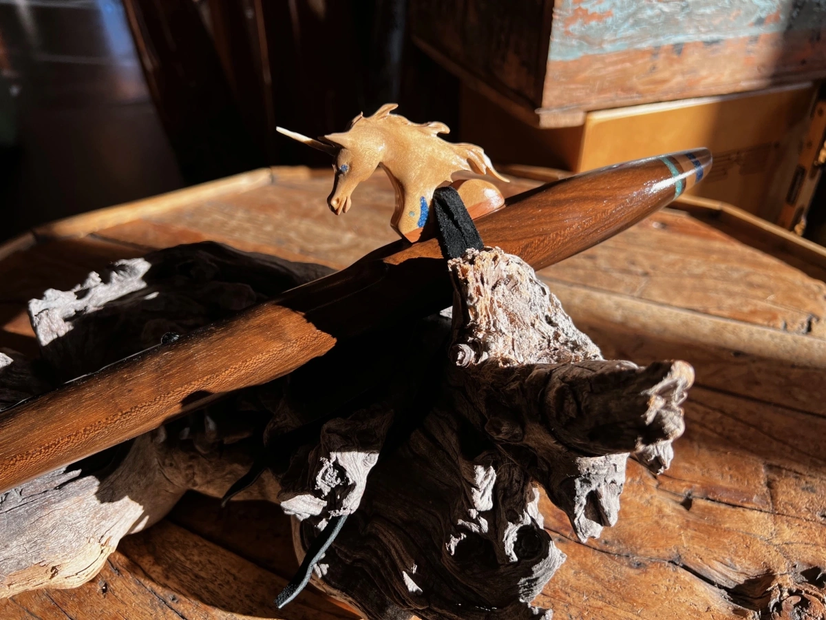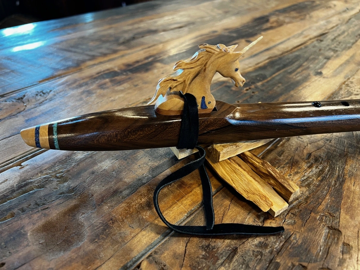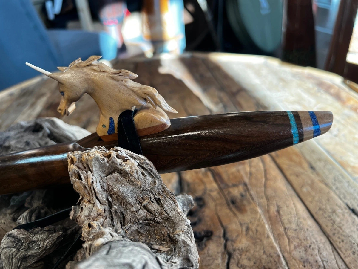Das Herzstück dieses Instruments ist der Einhorn Windblock, ein bemerkenswert liebevoll gestaltetes Kunstwerk mit einem echten Horn aus einem Stück Hirschgeweih. Das Einhorn ist so präzise, fein und lebendig geschnitzt, dass es eine besondere Art von Präsenz ausstrahlt – ein Symbol für Reinheit, Intuition, Licht und die Kraft des Wunders. Der Hirschhorneinsatz verbindet Himmel und Erde, sanfte Magie und kraftvolle Natur.