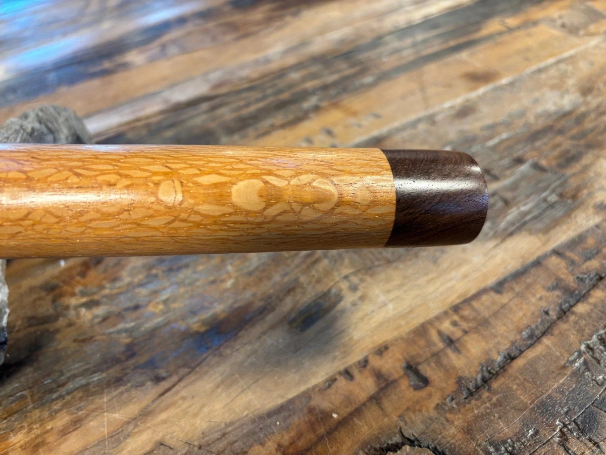 Diese handgefertigte Gebetsflöte aus Perlholz vereint die warme, schuppenartige Maserung dieses australischen Exotenholzes mit edlen Palisander-Akzenten und einem kunstvollen Otter-Windblock mit Onyx-Details. In E-Moll gestimmt entfaltet sie einen sanften, meditativen Klang, der Dich in innere Ruhe führt.